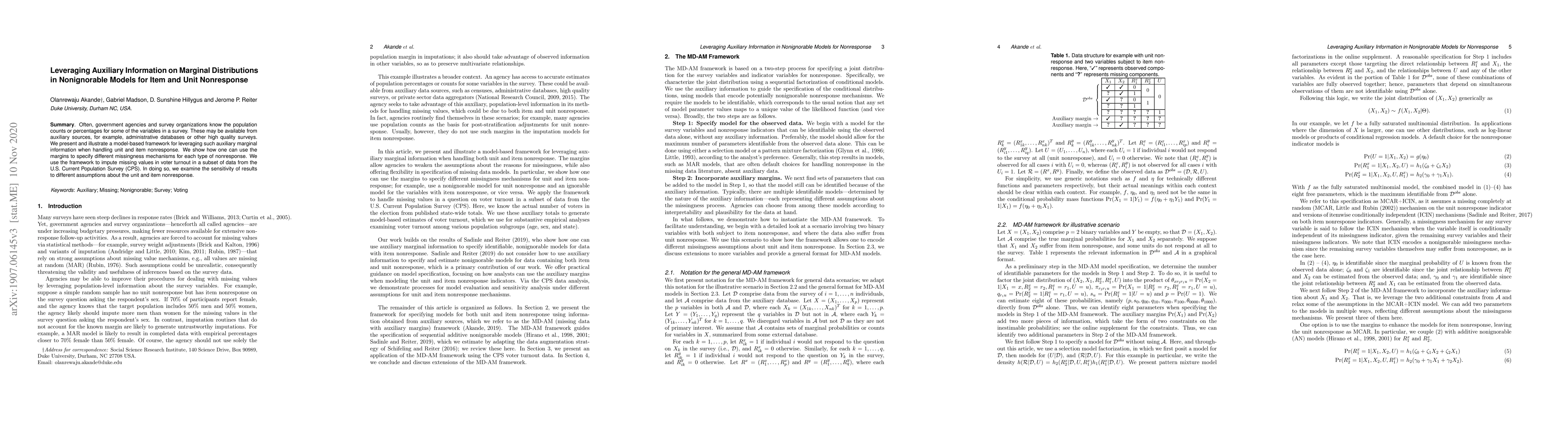 This paper proposes a model-based framework to utilize auxiliary marginal information from administrative databases or high-quality surveys to handle unit and item nonresponse. It demonstrates the framework's application in imputing missing voter turnout data from the U.S. Current Population Survey, examining the sensitivity of results to different nonresponse assumptions.