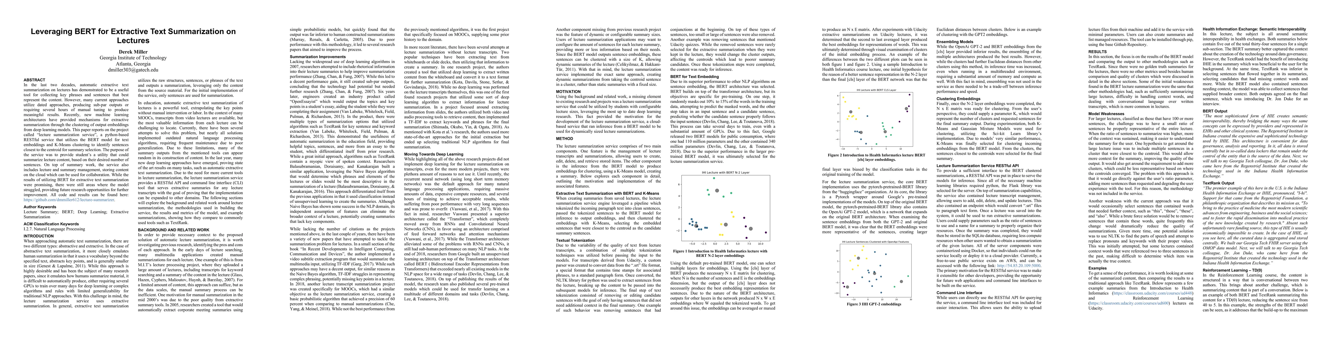 In the last two decades, automatic extractive text summarization on lectures has demonstrated to be a useful tool for collecting key phrases and sentences that best represent the content. However, many current approaches utilize dated approaches, producing sub-par outputs or requiring several hours of manual tuning to produce meaningful results. Recently, new machine learning architectures have provided mechanisms for extractive summarization through the clustering of output embeddings from deep learning models. This paper reports on the project called Lecture Summarization Service, a python based RESTful service that utilizes the BERT model for text embeddings and KMeans clustering to identify sentences closes to the centroid for summary selection. The purpose of the service was to provide students a utility that could summarize lecture content, based on their desired number of sentences. On top of the summary work, the service also includes lecture and summary management, storing content on the cloud which can be used for collaboration. While the results of utilizing BERT for extractive summarization were promising, there were still areas where the model struggled, providing feature research opportunities for further improvement.