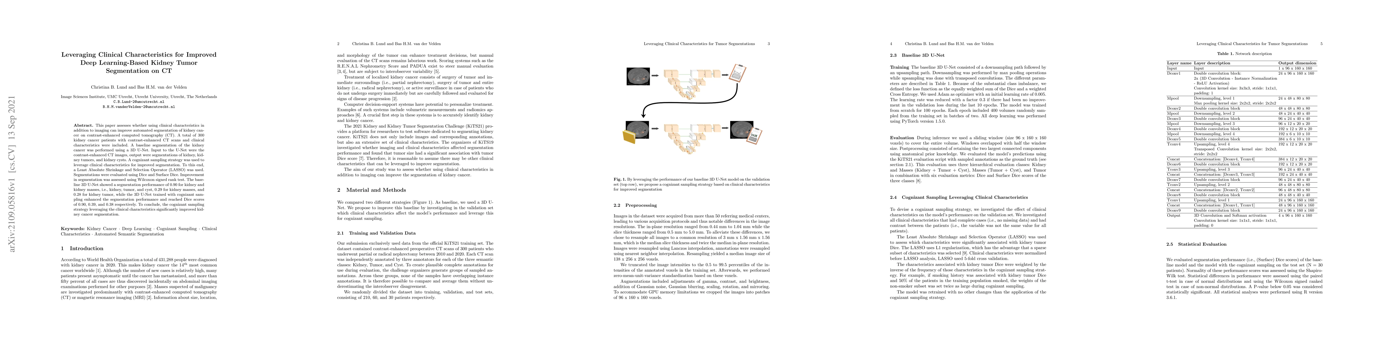 This study evaluates the use of clinical characteristics to enhance deep learning-based segmentation of kidney tumors on CT scans, showing significant improvement through a 3D U-Net model with a Least Absolute Shrinkage and Selection Operator (LASSO) approach. The enhanced model achieved better Dice scores for kidney and kidney masses compared to the baseline.