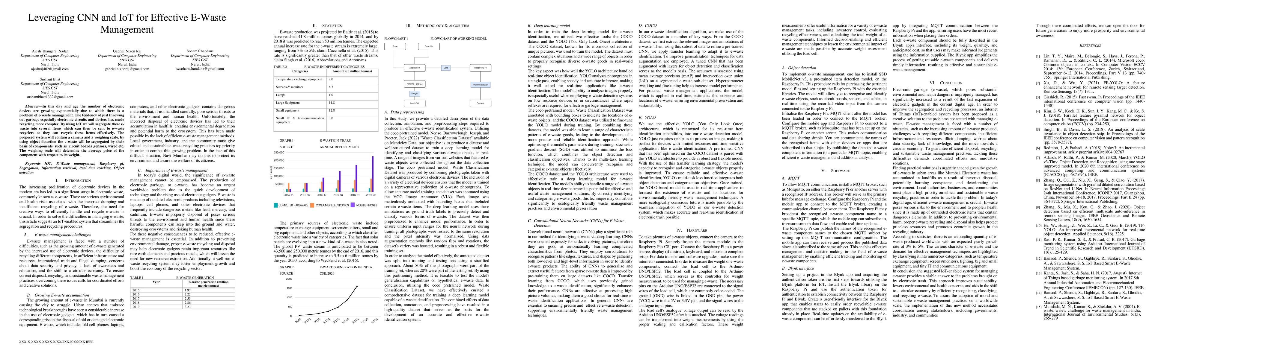 The increasing proliferation of electronic devices in the modern era has led to a significant surge in electronic waste (e-waste). Improper disposal and insufficient recycling of e-waste pose serious environmental and health risks. This paper proposes an IoT-enabled system combined with a lightweight CNN-based classification pipeline to enhance the identification, categorization, and routing of e-waste materials. By integrating a camera system and a digital weighing scale, the framework automates the classification of electronic items based on visual and weight-based attributes. The system demonstrates how real-time detection of e-waste components such as circuit boards, sensors, and wires can facilitate smart recycling workflows and improve overall waste processing efficiency.
