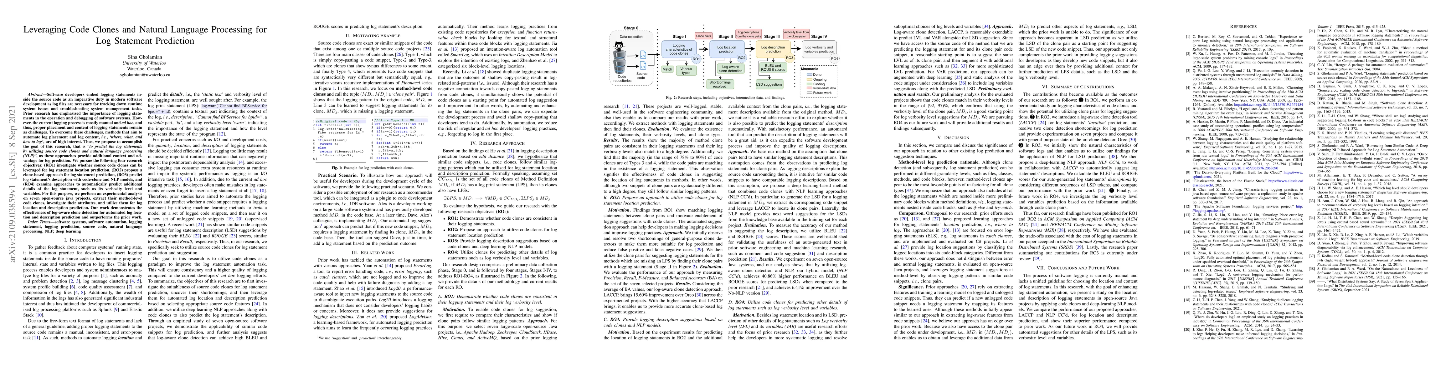 This paper proposes leveraging code clones and natural language processing to automate the prediction of log statements in software systems, aiming to address the challenges of manual and ad hoc logging. The study demonstrates the effectiveness of this approach through an experimental analysis on seven open-source Java projects, showing improved log location and description prediction.