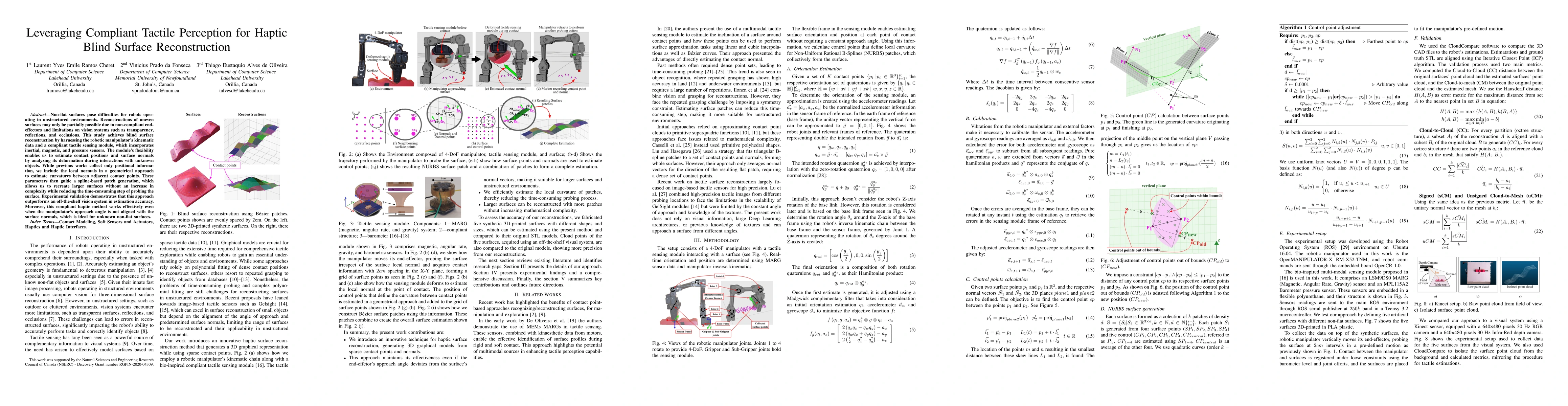 This study presents a compliant tactile perception system that leverages a robotic manipulator’s kinematic data and a flexible tactile sensor module to reconstruct unknown non-flat surfaces. The method estimates surface normals from sensor deformation, enabling accurate curvature estimation and spline-based surface reconstruction, outperforming traditional vision-based systems.