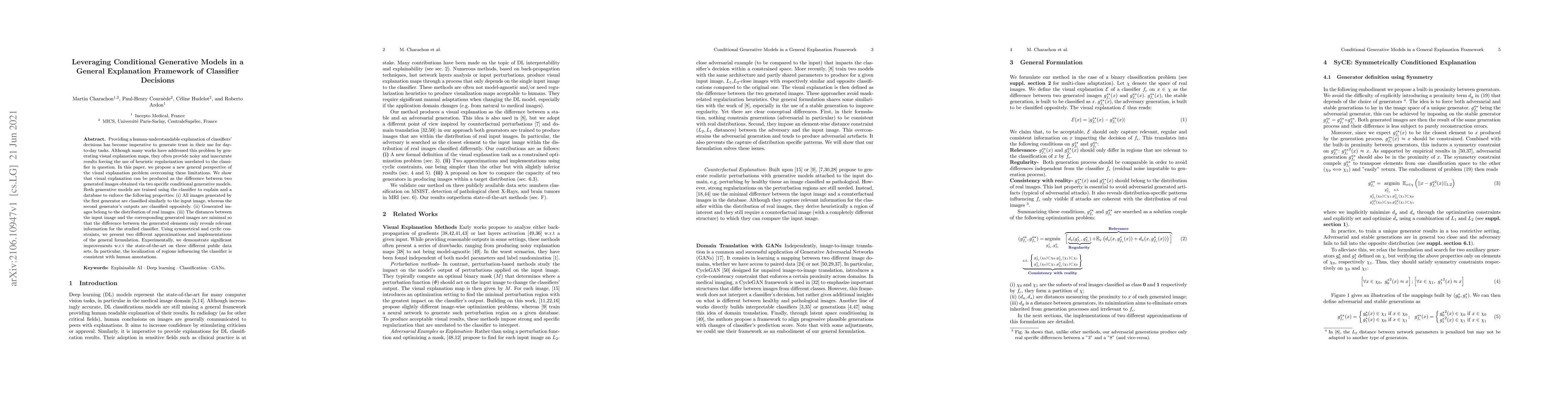 Providing a human-understandable explanation of classifiers' decisions has become imperative to generate trust in their use for day-to-day tasks. Although many works have addressed this problem by generating visual explanation maps, they often provide noisy and inaccurate results forcing the use of heuristic regularization unrelated to the classifier in question. In this paper, we propose a new general perspective of the visual explanation problem overcoming these limitations. We show that visual explanation can be produced as the difference between two generated images obtained via two specific conditional generative models. Both generative models are trained using the classifier to explain and a database to enforce the following properties: (i) All images generated by the first generator are classified similarly to the input image, whereas the second generator's outputs are classified oppositely. (ii) Generated images belong to the distribution of real images. (iii) The distances between the input image and the corresponding generated images are minimal so that the difference between the generated elements only reveals relevant information for the studied classifier. Using symmetrical and cyclic constraints, we present two different approximations and implementations of the general formulation. Experimentally, we demonstrate significant improvements w.r.t the state-of-the-art on three different public data sets. In particular, the localization of regions influencing the classifier is consistent with human annotations.