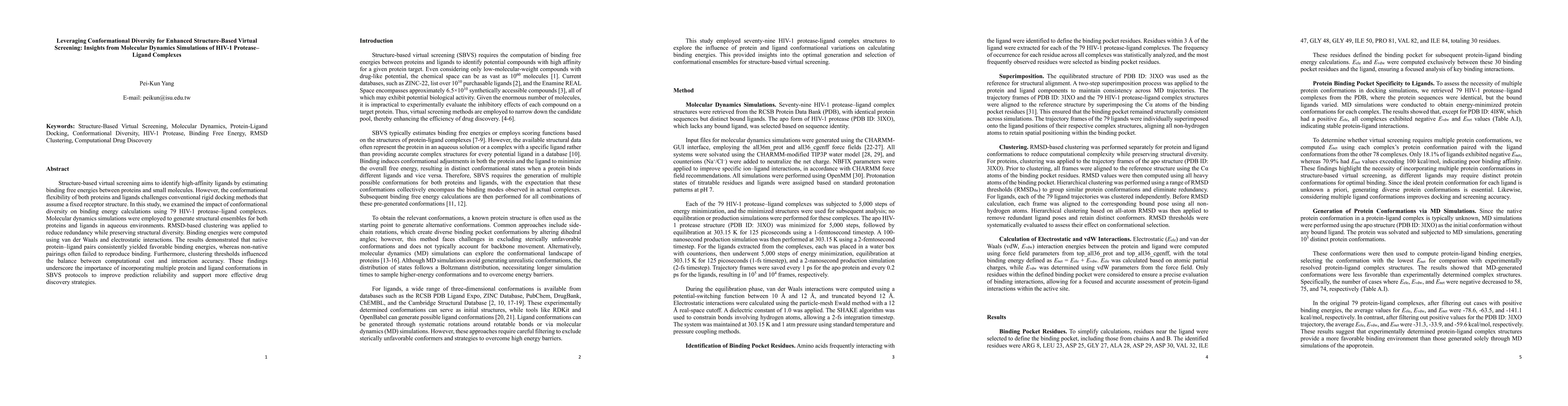 Structure-based virtual screening aims to identify high-affinity ligands by estimating binding free energies between proteins and small molecules. However, the conformational flexibility of both proteins and ligands challenges conventional rigid docking methods that assume a fixed receptor structure. In this study, we examined the impact of conformational diversity on binding energy calculations using 79 HIV-1 protease-ligand complexes. Molecular dynamics simulations were employed to generate structural ensembles for both proteins and ligands in aqueous environments. RMSD-based clustering was applied to reduce redundancy while preserving structural diversity. Binding energies were computed using van der Waals and electrostatic interactions. The results demonstrated that native protein-ligand pairs consistently yielded favorable binding energies, whereas non-native pairings often failed to reproduce binding. Furthermore, clustering thresholds influenced the balance between computational cost and interaction accuracy. These findings underscore the importance of incorporating multiple protein and ligand conformations in SBVS protocols to improve prediction reliability and support more effective drug discovery strategies.