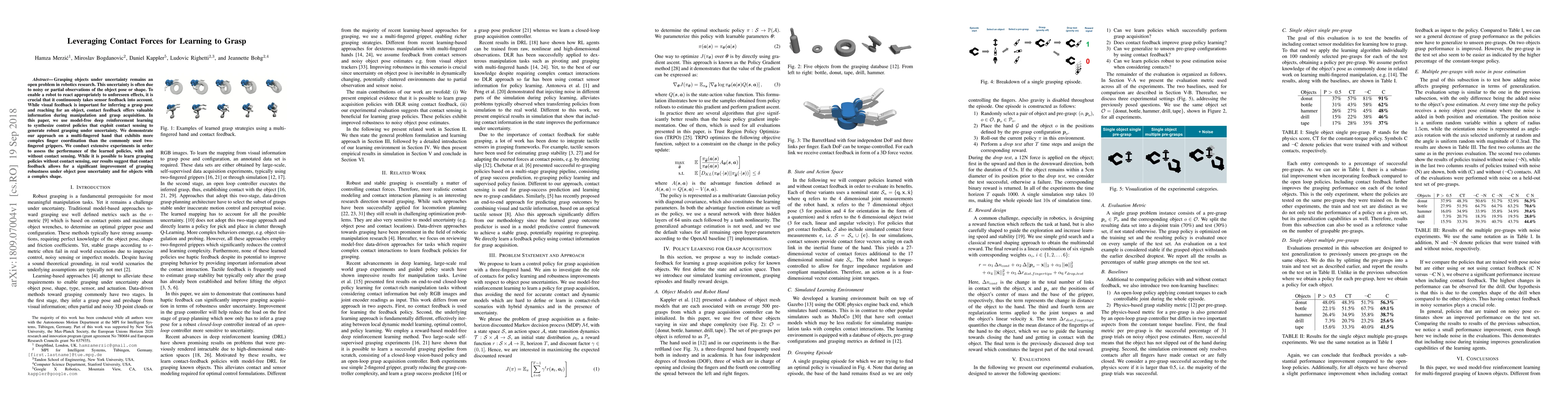 Grasping objects under uncertainty remains an open problem in robotics research. This uncertainty is often due to noisy or partial observations of the object pose or shape. To enable a robot to react appropriately to unforeseen effects, it is crucial that it continuously takes sensor feedback into account. While visual feedback is important for inferring a grasp pose and reaching for an object, contact feedback offers valuable information during manipulation and grasp acquisition. In this paper, we use model-free deep reinforcement learning to synthesize control policies that exploit contact sensing to generate robust grasping under uncertainty. We demonstrate our approach on a multi-fingered hand that exhibits more complex finger coordination than the commonly used two-fingered grippers. We conduct extensive experiments in order to assess the performance of the learned policies, with and without contact sensing. While it is possible to learn grasping policies without contact sensing, our results suggest that contact feedback allows for a significant improvement of grasping robustness under object pose uncertainty and for objects with a complex shape.