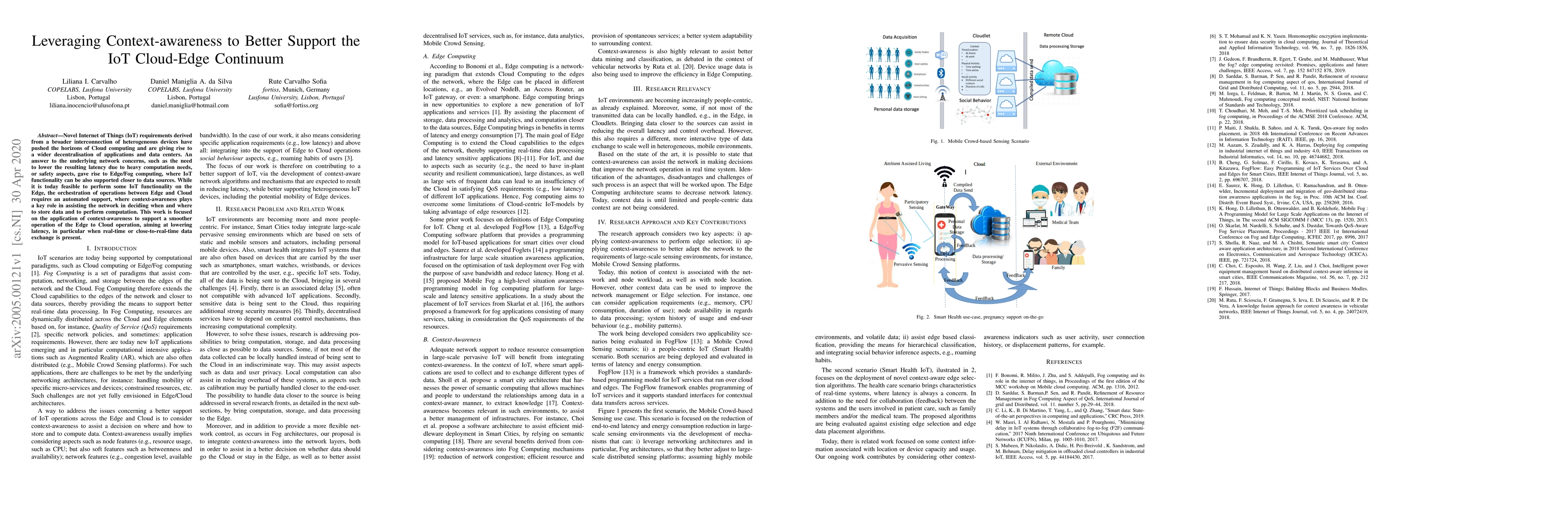 Novel Internet of Things (IoT) requirements derived from a broader interconnection of heterogeneous devices have pushed the horizons of Cloud computing and are giving rise to a wider decentralisation of applications and data centers. An answer to the underlying network concerns, such as the need to lower the resulting latency due to heavy computation needs,or safety aspects, gave rise to Edge/Fog computing, where IoT functionality can be also supported closer to data sources. While it is today feasible to perform some IoT functionality on the Edge, the orchestration of operations between Edge and Cloud requires an automated support, where context-awareness plays a key role in assisting the network in deciding when and whereto store data and to perform computation. This work is focused on the application of context-awareness to support a smoother operation of the Edge to Cloud operation, aiming at lowering latency, in particular when real-time or close-to-real-time data exchange is present.