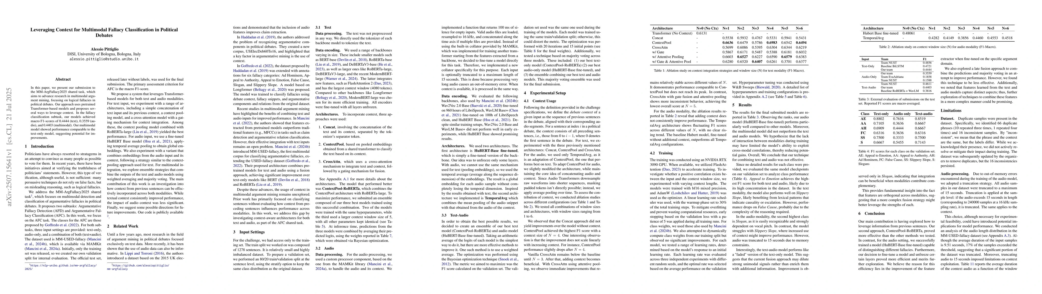 In this paper, we present our submission to the MM-ArgFallacy2025 shared task, which aims to advance research in multimodal argument mining, focusing on logical fallacies in political debates. Our approach uses pretrained Transformer-based models and proposes several ways to leverage context. In the fallacy classification subtask, our models achieved macro F1-scores of 0.4444 (text), 0.3559 (audio), and 0.4403 (multimodal). Our multimodal model showed performance comparable to the text-only model, suggesting potential for improvements.