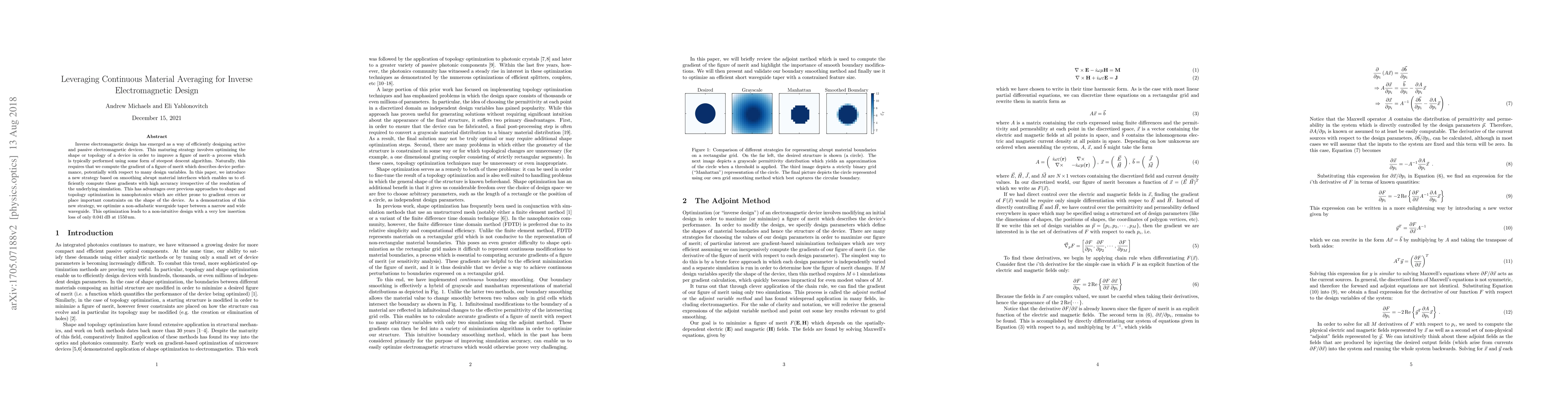 Researchers introduce a new strategy for optimizing electromagnetic devices using continuous material averaging, achieving high accuracy and low insertion loss in device design.