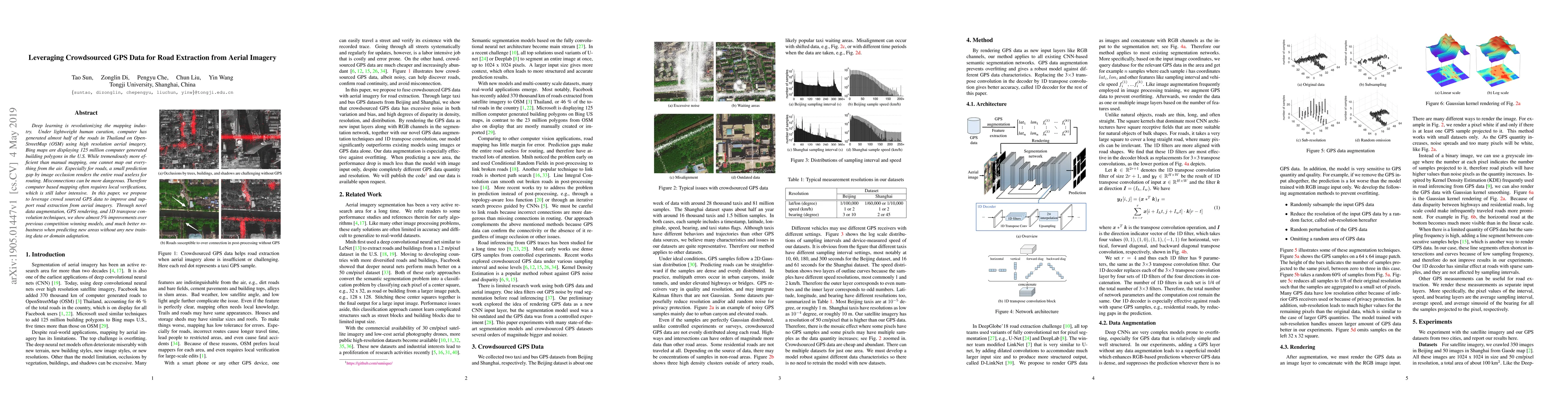 This paper proposes leveraging crowdsourced GPS data to enhance road extraction from aerial imagery, achieving nearly 5% improvement over previous models through data augmentation and 1D transpose convolution techniques, while demonstrating better robustness for new areas without additional training.