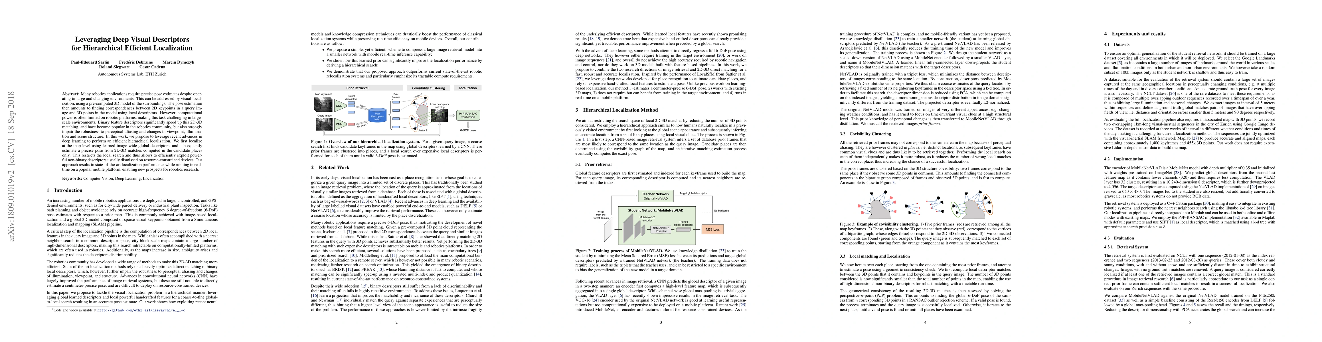 This paper proposes a deep learning-based hierarchical localization method for robotics, using global descriptors for initial map-level localization and precise pose estimation through efficient 2D-3D matching in candidate areas, achieving state-of-the-art performance in real-time on mobile platforms.
