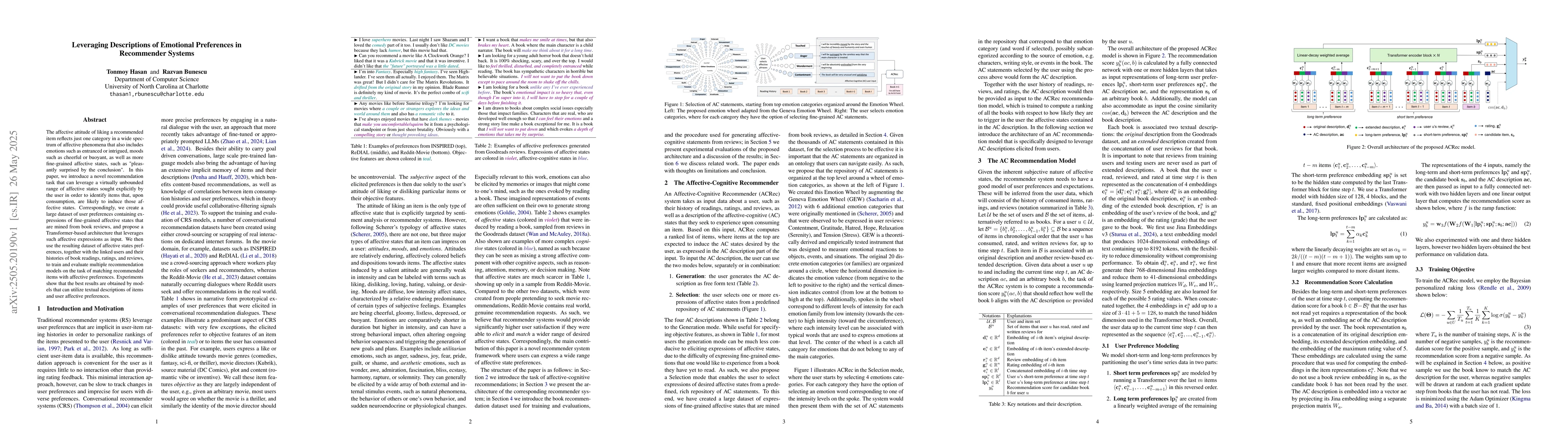 The paper presents a Transformer-based architecture designed to incorporate textual descriptions of items and user affective preferences for enhanced recommendation performance.