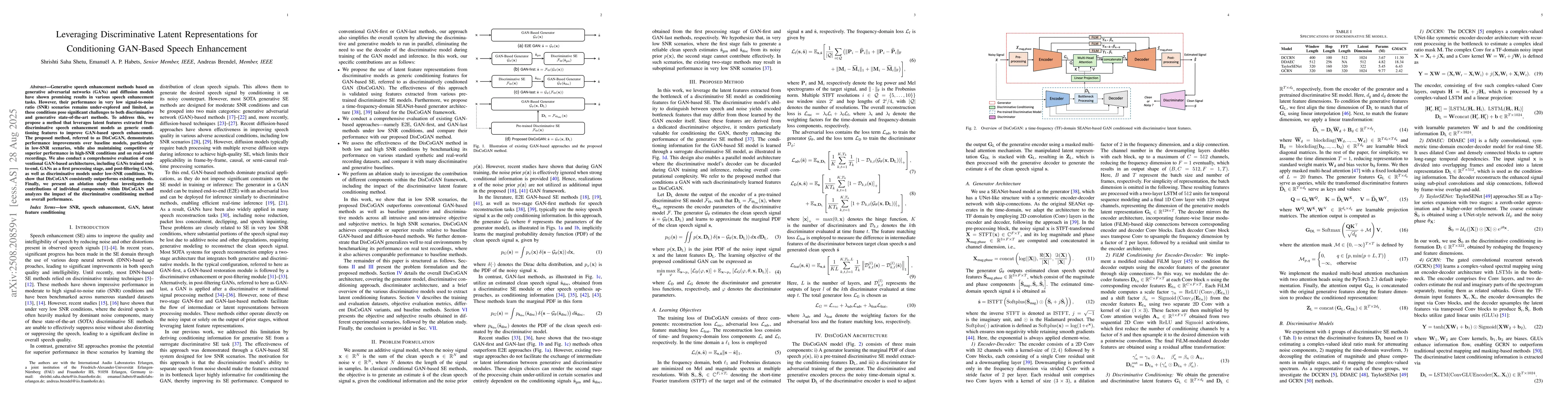 Generative speech enhancement methods based on generative adversarial networks (GANs) and diffusion models have shown promising results in various speech enhancement tasks. However, their performance in very low signal-to-noise ratio (SNR) scenarios remains under-explored and limited, as these conditions pose significant challenges to both discriminative and generative state-of-the-art methods. To address this, we propose a method that leverages latent features extracted from discriminative speech enhancement models as generic conditioning features to improve GAN-based speech enhancement. The proposed method, referred to as DisCoGAN, demonstrates performance improvements over baseline models, particularly in low-SNR scenarios, while also maintaining competitive or superior performance in high-SNR conditions and on real-world recordings. We also conduct a comprehensive evaluation of conventional GAN-based architectures, including GANs trained end-to-end, GANs as a first processing stage, and post-filtering GANs, as well as discriminative models under low-SNR conditions. We show that DisCoGAN consistently outperforms existing methods. Finally, we present an ablation study that investigates the contributions of individual components within DisCoGAN and analyzes the impact of the discriminative conditioning method on overall performance.