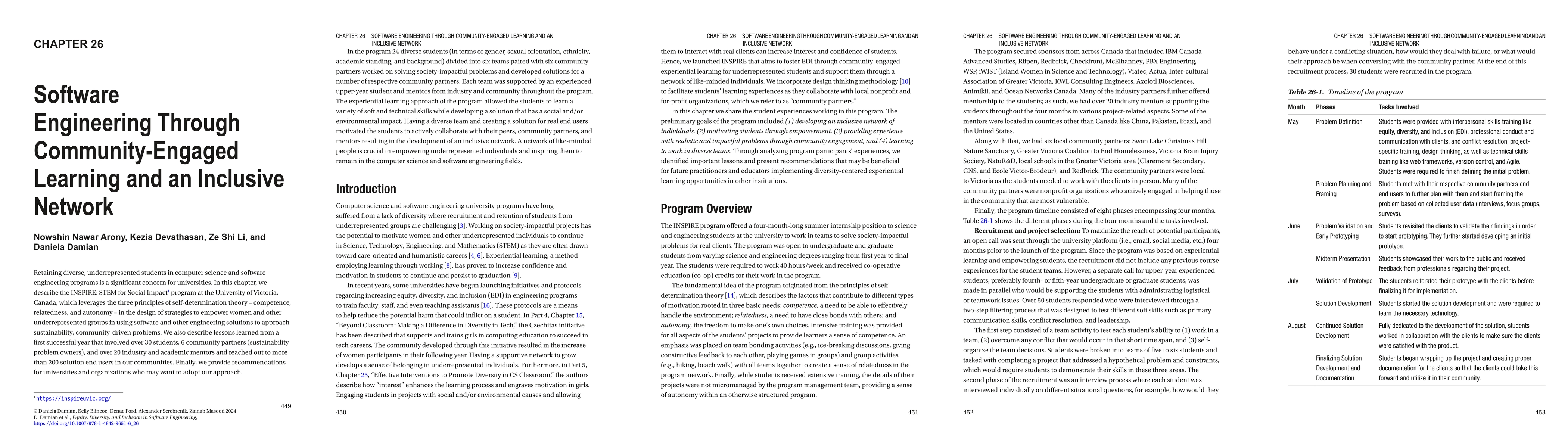 This paper details the INSPIRE: STEM for Social Impact program at the University of Victoria, which engages underrepresented students in community-based software engineering projects, fostering a supportive network and promoting diversity through experiential learning. The program's success in motivating students aligns with self-determination theory, highlighting the importance of competence, relatedness, and autonomy in retaining students in the field.