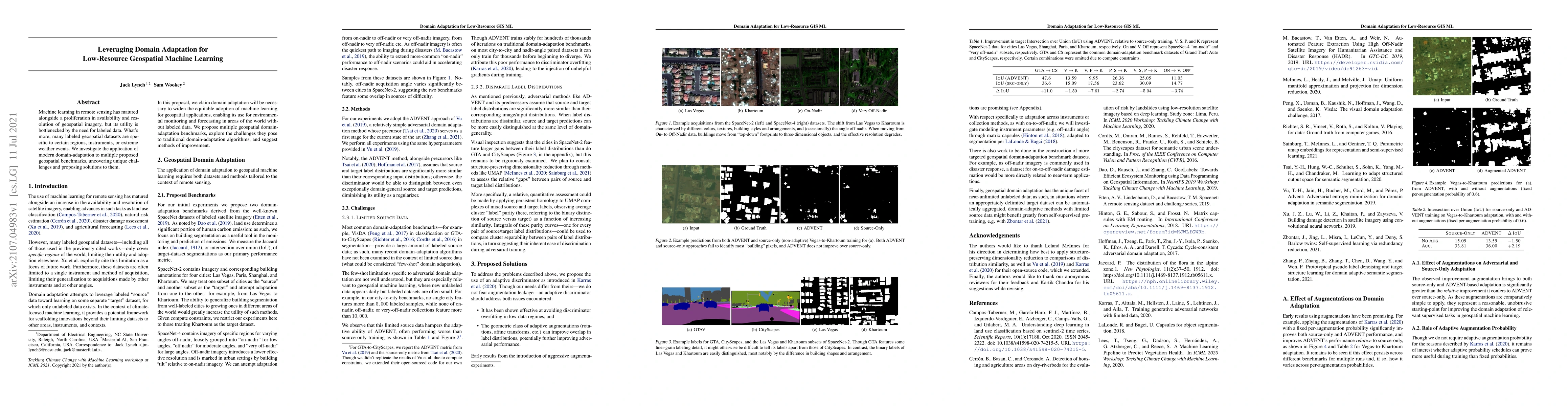 This paper explores the use of domain adaptation techniques to address the scarcity of labeled data in low-resource geospatial machine learning, proposing solutions to overcome the challenges posed by region-specific datasets. The study evaluates these methods on multiple geospatial benchmarks.