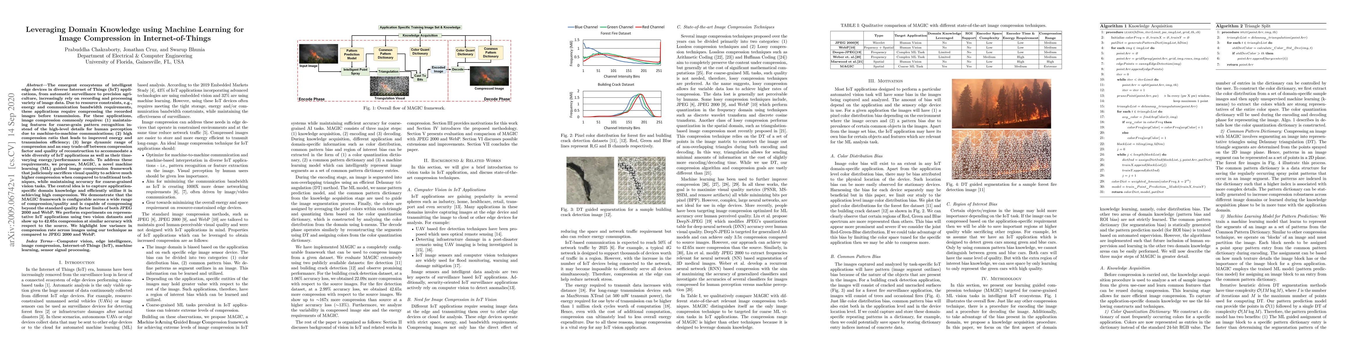 The emergent ecosystems of intelligent edge devices in diverse Internet of Things (IoT) applications, from automatic surveillance to precision agriculture, increasingly rely on recording and processing variety of image data. Due to resource constraints, e.g., energy and communication bandwidth requirements, these applications require compressing the recorded images before transmission. For these applications, image compression commonly requires: (1) maintaining features for coarse-grain pattern recognition instead of the high-level details for human perception due to machine-to-machine communications; (2) high compression ratio that leads to improved energy and transmission efficiency; (3) large dynamic range of compression and an easy trade-off between compression factor and quality of reconstruction to accommodate a wide diversity of IoT applications as well as their time-varying energy/performance needs. To address these requirements, we propose, MAGIC, a novel machine learning (ML) guided image compression framework that judiciously sacrifices visual quality to achieve much higher compression when compared to traditional techniques, while maintaining accuracy for coarse-grained vision tasks. The central idea is to capture application-specific domain knowledge and efficiently utilize it in achieving high compression. We demonstrate that the MAGIC framework is configurable across a wide range of compression/quality and is capable of compressing beyond the standard quality factor limits of both JPEG 2000 and WebP. We perform experiments on representative IoT applications using two vision datasets and show up to 42.65x compression at similar accuracy with respect to the source. We highlight low variance in compression rate across images using our technique as compared to JPEG 2000 and WebP.