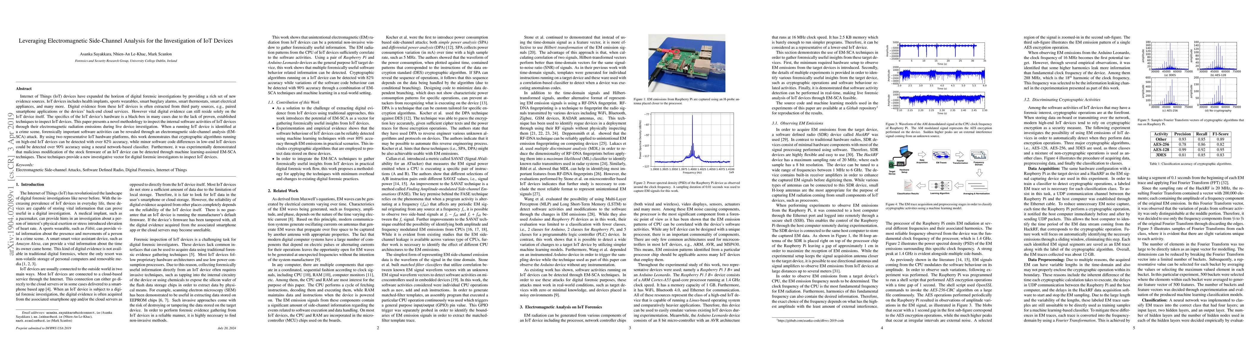 Internet of Things (IoT) devices have expanded the horizon of digital forensic investigations by providing a rich set of new evidence sources. IoT devices includes health implants, sports wearables, smart burglary alarms, smart thermostats, smart electrical appliances, and many more. Digital evidence from these IoT devices is often extracted from third party sources, e.g., paired smartphone applications or the devices' back-end cloud services. However vital digital evidence can still reside solely on the IoT device itself. The specifics of the IoT device's hardware is a black-box in many cases due to the lack of proven, established techniques to inspect IoT devices. This paper presents a novel methodology to inspect the internal software activities of IoT devices through their electromagnetic radiation emissions during live device investigation. When a running IoT device is identified at a crime scene, forensically important software activities can be revealed through an electromagnetic side-channel analysis (EM-SCA) attack. By using two representative IoT hardware platforms, this work demonstrates that cryptographic algorithms running on high-end IoT devices can be detected with over 82% accuracy, while minor software code differences in low-end IoT devices could be detected over 90% accuracy using a neural network-based classifier. Furthermore, it was experimentally demonstrated that malicious modification of the stock firmware of an IoT device can be detected through machine learning-assisted EM-SCA techniques. These techniques provide a new investigative vector for digital forensic investigators to inspect IoT devices.