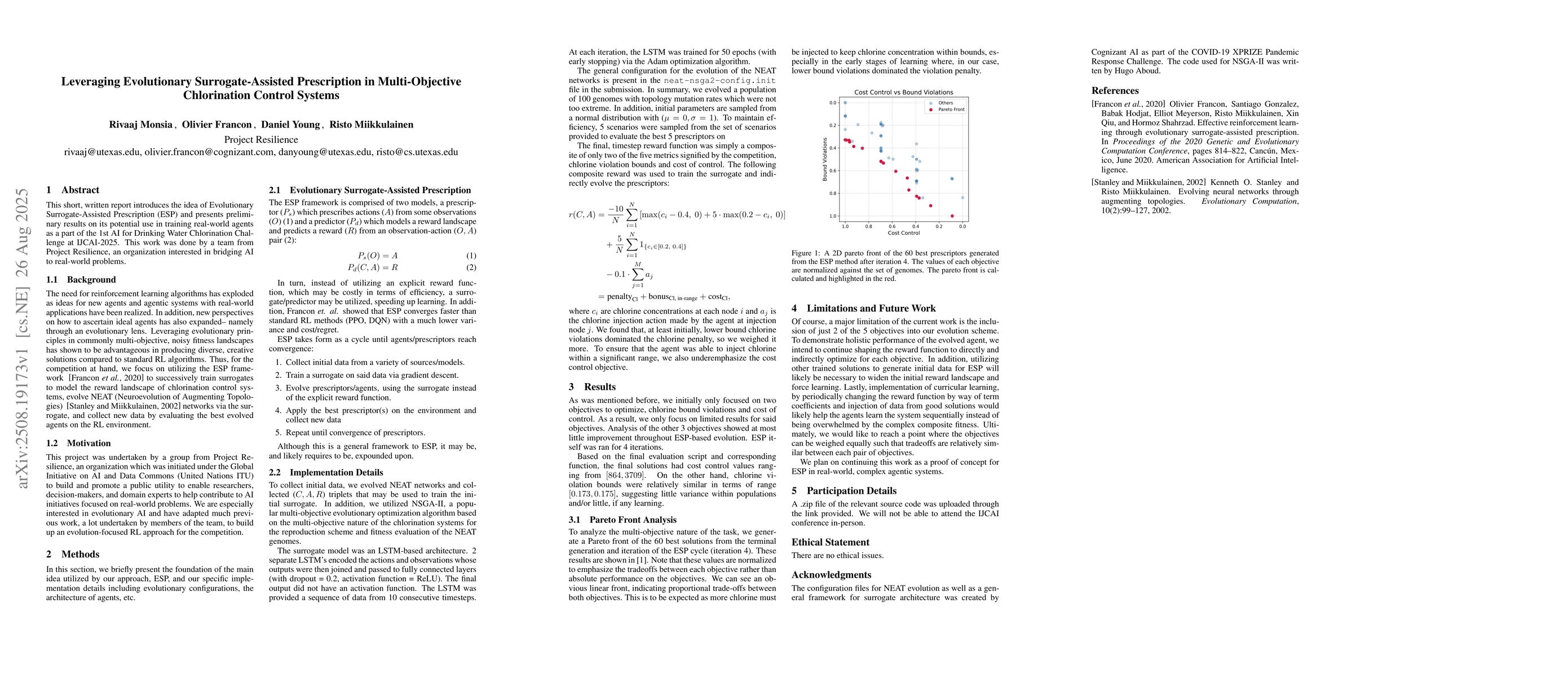 This short, written report introduces the idea of Evolutionary Surrogate-Assisted Prescription (ESP) and presents preliminary results on its potential use in training real-world agents as a part of the 1st AI for Drinking Water Chlorination Challenge at IJCAI-2025. This work was done by a team from Project Resilience, an organization interested in bridging AI to real-world problems.