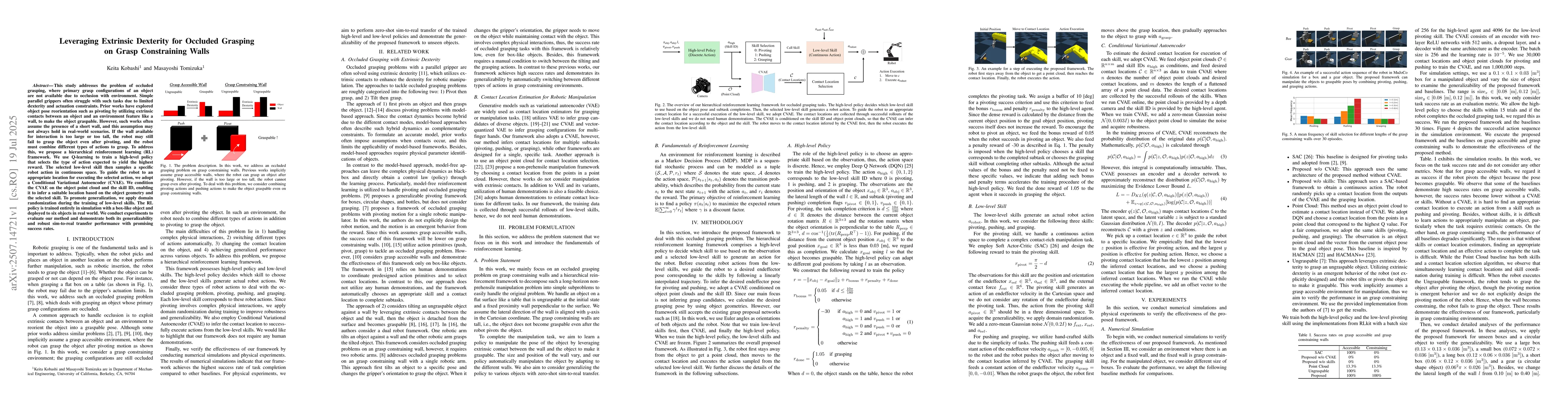 This study addresses the problem of occluded grasping, where primary grasp configurations of an object are not available due to occlusion with environment. Simple parallel grippers often struggle with such tasks due to limited dexterity and actuation constraints. Prior works have explored object pose reorientation such as pivoting by utilizing extrinsic contacts between an object and an environment feature like a wall, to make the object graspable. However, such works often assume the presence of a short wall, and this assumption may not always hold in real-world scenarios. If the wall available for interaction is too large or too tall, the robot may still fail to grasp the object even after pivoting, and the robot must combine different types of actions to grasp. To address this, we propose a hierarchical reinforcement learning (RL) framework. We use Q-learning to train a high-level policy that selects the type of action expected to yield the highest reward. The selected low-level skill then samples a specific robot action in continuous space. To guide the robot to an appropriate location for executing the selected action, we adopt a Conditional Variational Autoencoder (CVAE). We condition the CVAE on the object point cloud and the skill ID, enabling it to infer a suitable location based on the object geometry and the selected skill. To promote generalization, we apply domain randomization during the training of low-level skills. The RL policy is trained entirely in simulation with a box-like object and deployed to six objects in real world. We conduct experiments to evaluate our method and demonstrate both its generalizability and robust sim-to-real transfer performance with promising success rates.