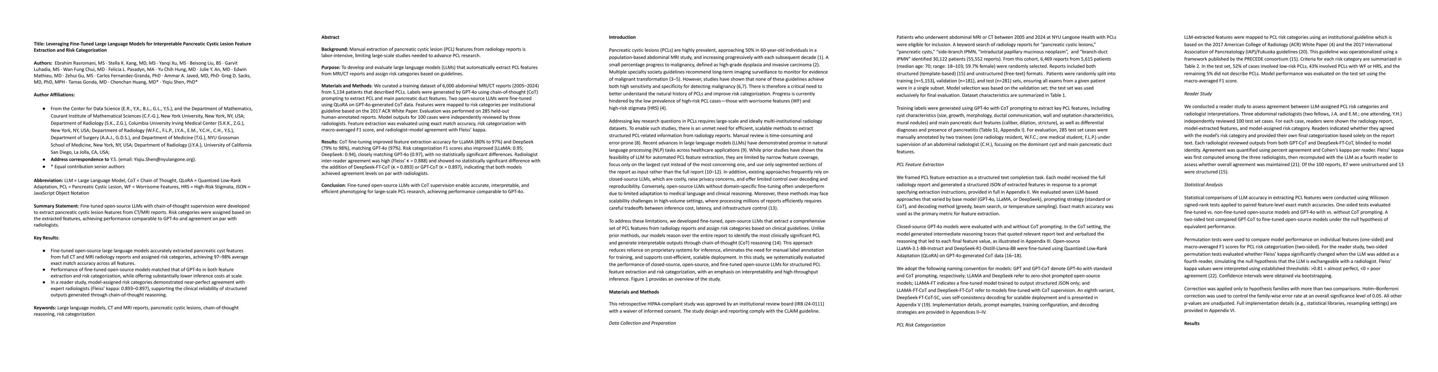 Background: Manual extraction of pancreatic cystic lesion (PCL) features from radiology reports is labor-intensive, limiting large-scale studies needed to advance PCL research. Purpose: To develop and evaluate large language models (LLMs) that automatically extract PCL features from MRI/CT reports and assign risk categories based on guidelines. Materials and Methods: We curated a training dataset of 6,000 abdominal MRI/CT reports (2005-2024) from 5,134 patients that described PCLs. Labels were generated by GPT-4o using chain-of-thought (CoT) prompting to extract PCL and main pancreatic duct features. Two open-source LLMs were fine-tuned using QLoRA on GPT-4o-generated CoT data. Features were mapped to risk categories per institutional guideline based on the 2017 ACR White Paper. Evaluation was performed on 285 held-out human-annotated reports. Model outputs for 100 cases were independently reviewed by three radiologists. Feature extraction was evaluated using exact match accuracy, risk categorization with macro-averaged F1 score, and radiologist-model agreement with Fleiss' Kappa. Results: CoT fine-tuning improved feature extraction accuracy for LLaMA (80% to 97%) and DeepSeek (79% to 98%), matching GPT-4o (97%). Risk categorization F1 scores also improved (LLaMA: 0.95; DeepSeek: 0.94), closely matching GPT-4o (0.97), with no statistically significant differences. Radiologist inter-reader agreement was high (Fleiss' Kappa = 0.888) and showed no statistically significant difference with the addition of DeepSeek-FT-CoT (Fleiss' Kappa = 0.893) or GPT-CoT (Fleiss' Kappa = 0.897), indicating that both models achieved agreement levels on par with radiologists. Conclusion: Fine-tuned open-source LLMs with CoT supervision enable accurate, interpretable, and efficient phenotyping for large-scale PCL research, achieving performance comparable to GPT-4o.