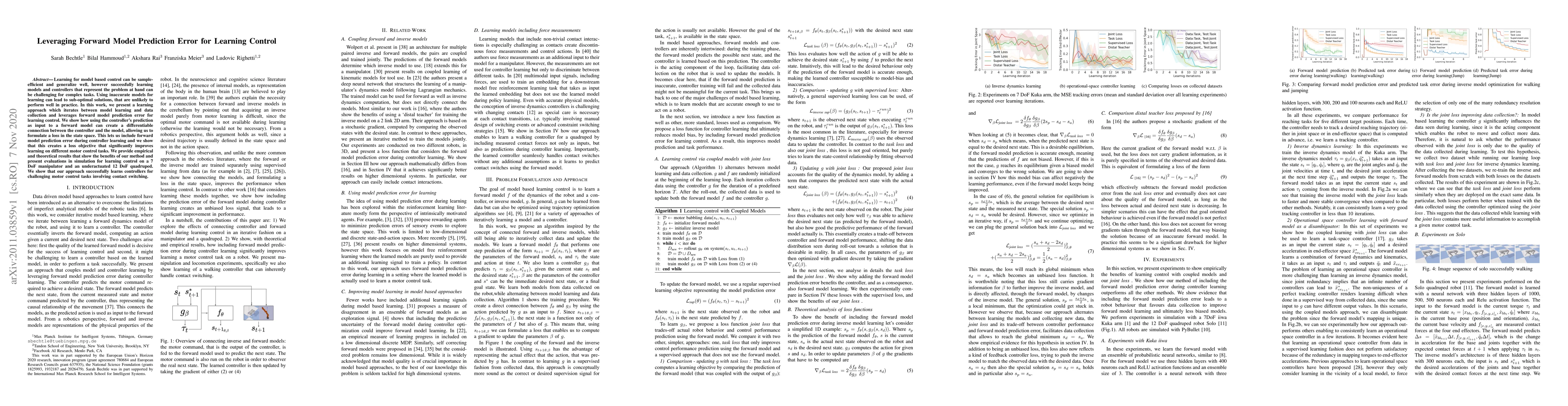 Learning for model based control can be sample-efficient and generalize well, however successfully learning models and controllers that represent the problem at hand can be challenging for complex tasks. Using inaccurate models for learning can lead to sub-optimal solutions, that are unlikely to perform well in practice. In this work, we present a learning approach which iterates between model learning and data collection and leverages forward model prediction error for learning control. We show how using the controller's prediction as input to a forward model can create a differentiable connection between the controller and the model, allowing us to formulate a loss in the state space. This lets us include forward model prediction error during controller learning and we show that this creates a loss objective that significantly improves learning on different motor control tasks. We provide empirical and theoretical results that show the benefits of our method and present evaluations in simulation for learning control on a 7 DoF manipulator and an underactuated 12 DoF quadruped. We show that our approach successfully learns controllers for challenging motor control tasks involving contact switching.
