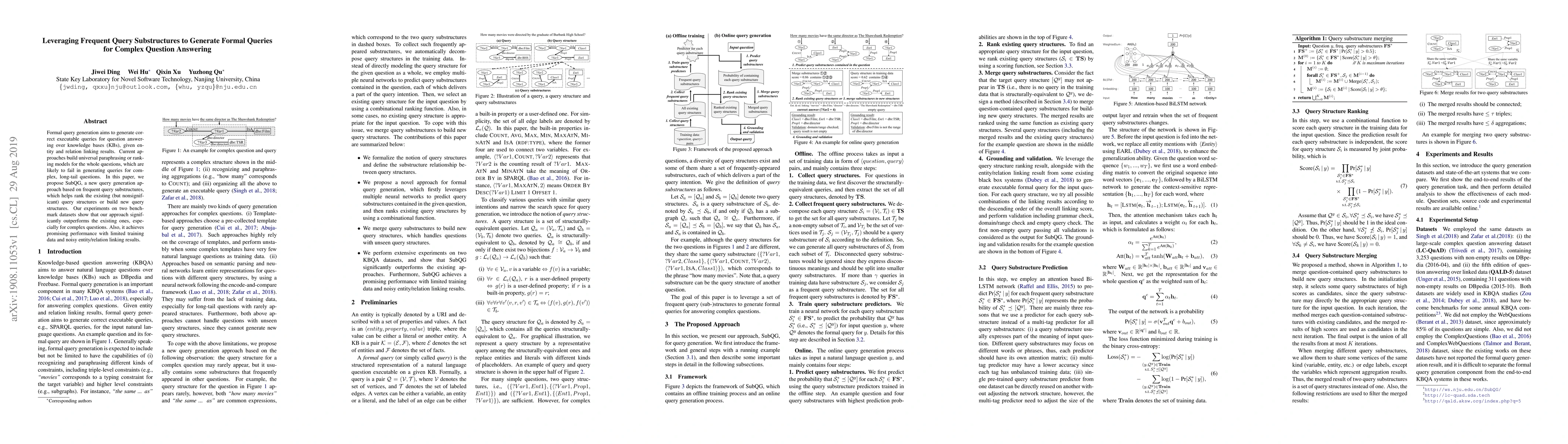 This paper introduces SubQG, a novel query generation method leveraging frequent query substructures to create executable queries for complex question answering over knowledge bases. The approach significantly outperforms existing methods, especially for complex, long-tail questions, and demonstrates promising results with limited training data and noisy linking results.