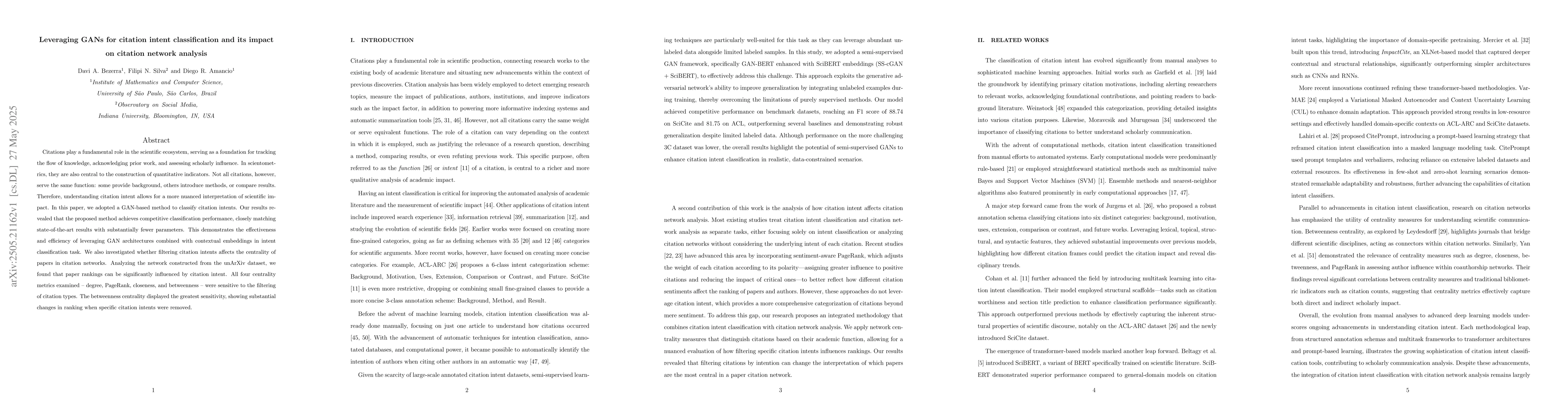 This work distinguishes itself by combining GANs with contextual embeddings for intent classification, and by demonstrating the sensitivity of citation network centrality metrics to citation intent filtering.
