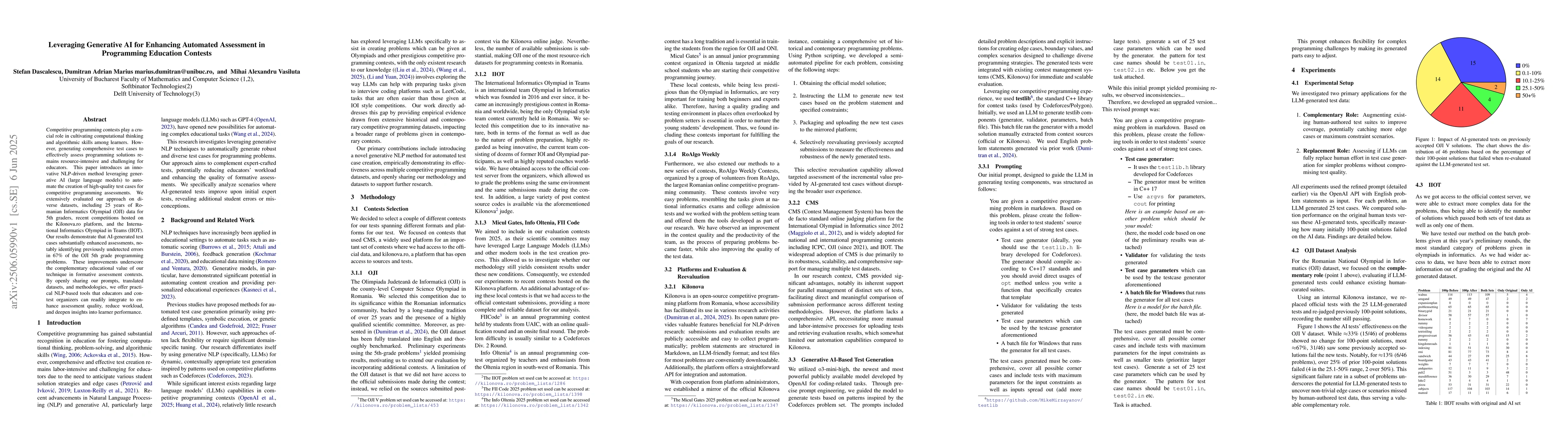 Competitive programming contests play a crucial role in cultivating computational thinking and algorithmic skills among learners. However, generating comprehensive test cases to effectively assess programming solutions remains resource-intensive and challenging for educators. This paper introduces an innovative NLP-driven method leveraging generative AI (large language models) to automate the creation of high-quality test cases for competitive programming assessments. We extensively evaluated our approach on diverse datasets, including 25 years of Romanian Informatics Olympiad (OJI) data for 5th graders, recent competitions hosted on the Kilonova.ro platform, and the International Informatics Olympiad in Teams (IIOT). Our results demonstrate that AI-generated test cases substantially enhanced assessments, notably identifying previously undetected errors in 67% of the OJI 5th grade programming problems. These improvements underscore the complementary educational value of our technique in formative assessment contexts. By openly sharing our prompts, translated datasets, and methodologies, we offer practical NLP-based tools that educators and contest organizers can readily integrate to enhance assessment quality, reduce workload, and deepen insights into learner performance.