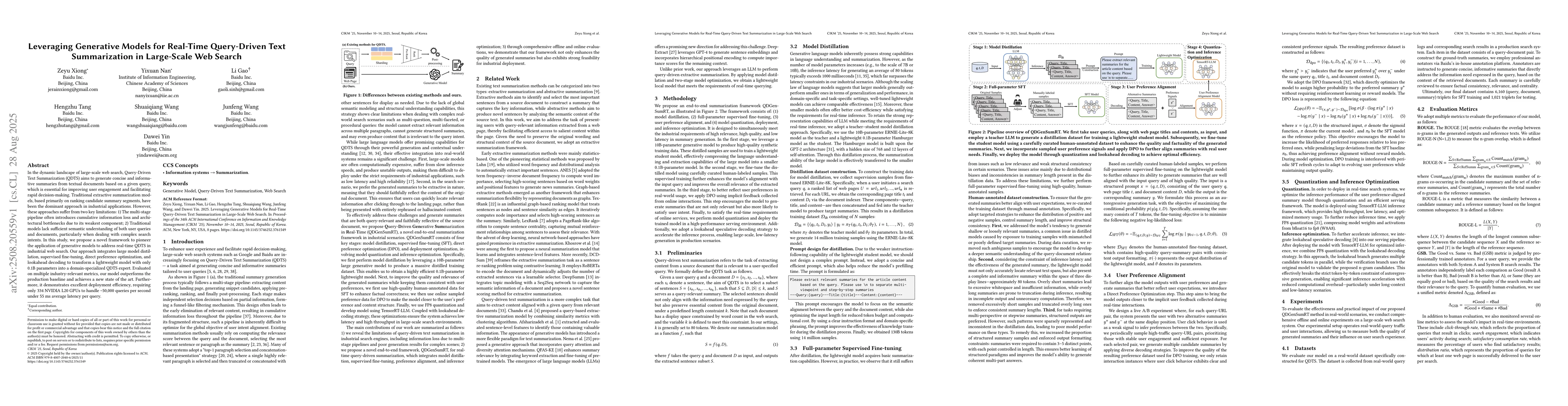 In the dynamic landscape of large-scale web search, Query-Driven Text Summarization (QDTS) aims to generate concise and informative summaries from textual documents based on a given query, which is essential for improving user engagement and facilitating rapid decision-making. Traditional extractive summarization models, based primarily on ranking candidate summary segments, have been the dominant approach in industrial applications. However, these approaches suffer from two key limitations: 1) The multi-stage pipeline often introduces cumulative information loss and architectural bottlenecks due to its weakest component; 2) Traditional models lack sufficient semantic understanding of both user queries and documents, particularly when dealing with complex search intents. In this study, we propose a novel framework to pioneer the application of generative models to address real-time QDTS in industrial web search. Our approach integrates large model distillation, supervised fine-tuning, direct preference optimization, and lookahead decoding to transform a lightweight model with only 0.1B parameters into a domain-specialized QDTS expert. Evaluated on multiple industry-relevant metrics, our model outperforms the production baseline and achieves a new state of the art. Furthermore, it demonstrates excellent deployment efficiency, requiring only 334 NVIDIA L20 GPUs to handle \textasciitilde50,000 queries per second under 55~ms average latency per query.