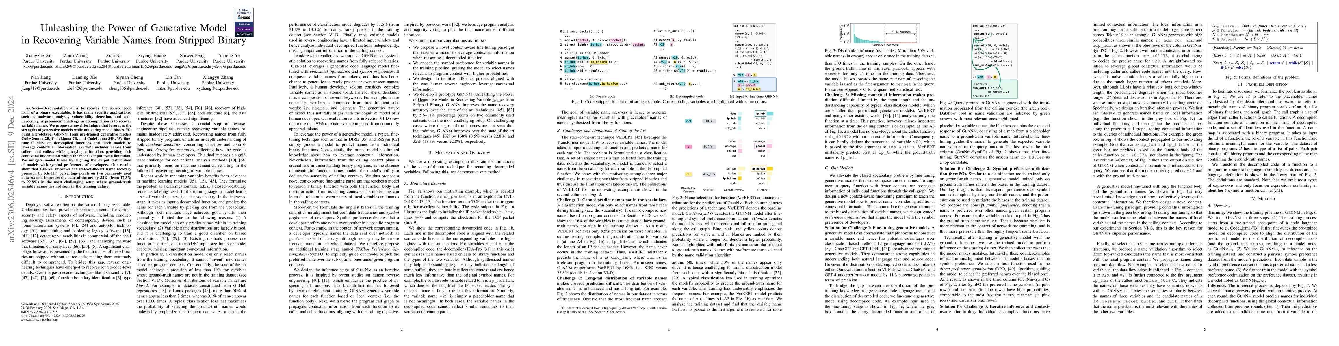 This research proposes a generative model, GenNm, to improve the recovery of variable names in decompiled binary executables, achieving a state-of-the-art improvement from 48.1% to 57.9% in accuracy, by leveraging generative models and program analysis to provide contextual information.