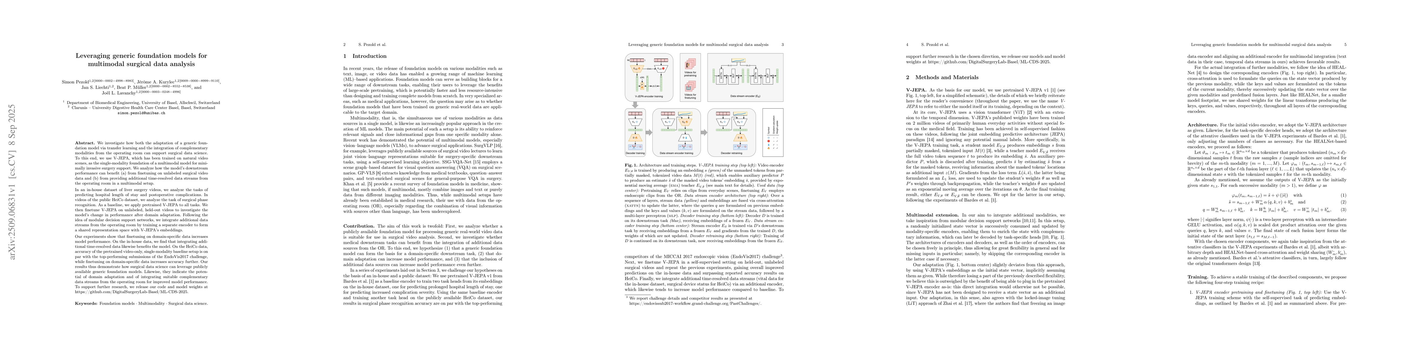 We investigate how both the adaptation of a generic foundation model via transfer learning and the integration of complementary modalities from the operating room (OR) can support surgical data science. To this end, we use V-JEPA as the single-modality foundation of a multimodal model for minimally invasive surgery support. We analyze how the model's downstream performance can benefit (a) from finetuning on unlabeled surgical video data and (b) from providing additional time-resolved data streams from the OR in a multimodal setup. In an in-house dataset of liver surgery videos, we analyze the tasks of predicting hospital length of stay and postoperative complications. In videos of the public HeiCo dataset, we analyze the task of surgical phase recognition. As a baseline, we apply pretrained V-JEPA to all tasks. We then finetune it on unlabeled, held-out videos to investigate its change in performance after domain adaptation. Following the idea of modular decision support networks, we integrate additional data streams from the OR by training a separate encoder to form a shared representation space with V-JEPA's embeddings. Our experiments show that finetuning on domain-specific data increases model performance. On the in-house data, integrating additional time-resolved data likewise benefits the model. On the HeiCo data, accuracy of the pretrained video-only, single-modality baseline setup is on par with the top-performing submissions of the EndoVis2017 challenge, while finetuning on domain-specific data increases accuracy further. Our results thus demonstrate how surgical data science can leverage public, generic foundation models. Likewise, they indicate the potential of domain adaptation and of integrating suitable complementary data streams from the OR. To support further research, we release our code and model weights at https://github.com/DigitalSurgeryLab-Basel/ML-CDS-2025.