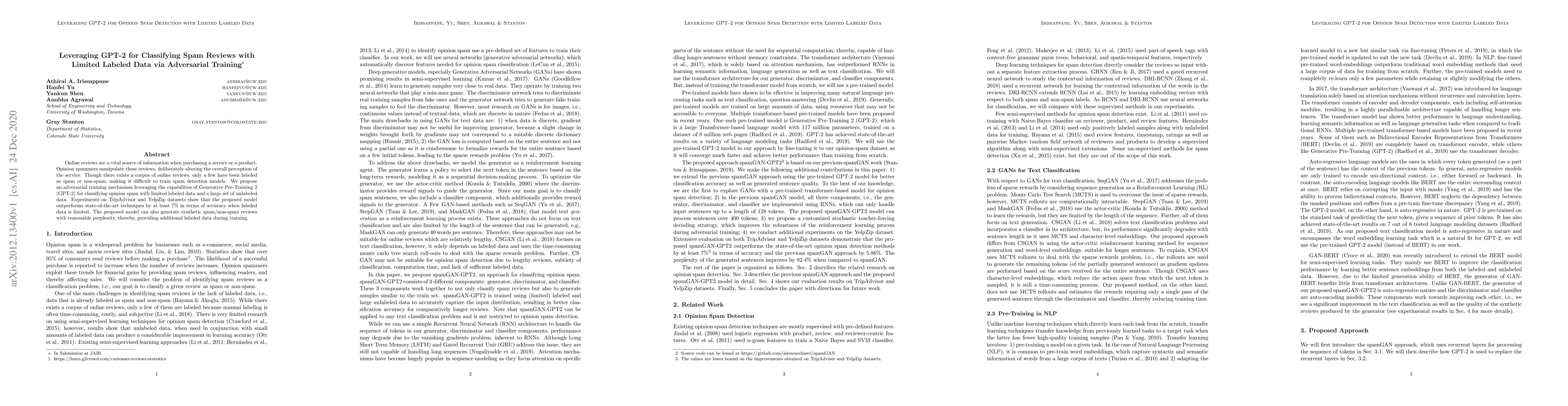 This paper proposes an adversarial training method using GPT-2 to classify spam reviews with limited labeled data, leveraging a large set of unlabeled data. The model outperforms existing techniques by at least 7% in accuracy and can generate synthetic spam/non-spam reviews to augment training data.