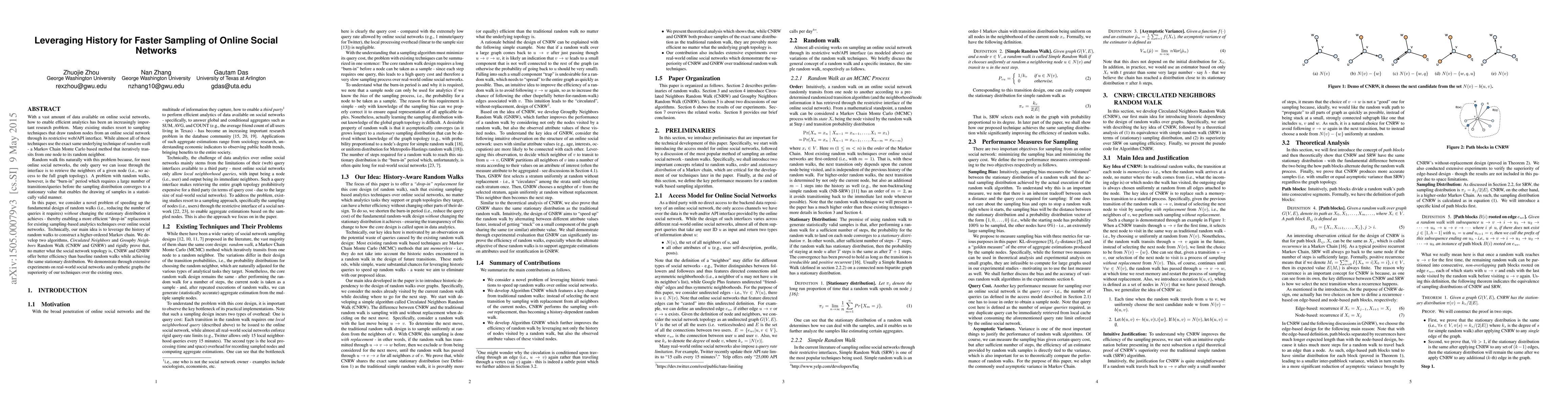 This paper proposes new algorithms, Circulated Neighbors and Groupby Neighbors Random Walk (CNRW and GNRW), to speed up sampling in online social networks by leveraging historical random walk data to construct a higher-order Markov chain. These methods reduce the number of queries required compared to traditional random walk methods, achieving the same stationary distribution while offering better efficiency.