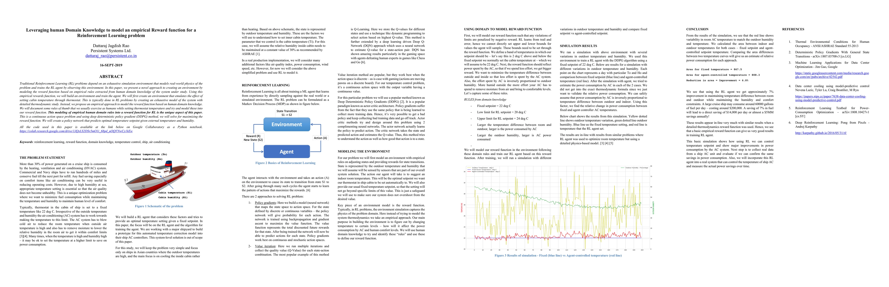 Traditional Reinforcement Learning (RL) problems depend on an exhaustive simulation environment that models real-world physics of the problem and trains the RL agent by observing this environment. In this paper, we present a novel approach to creating an environment by modeling the reward function based on empirical rules extracted from human domain knowledge of the system under study. Using this empirical rewards function, we will build an environment and train the agent. We will first create an environment that emulates the effect of setting cabin temperature through thermostat. This is typically done in RL problems by creating an exhaustive model of the system with detailed thermodynamic study. Instead, we propose an empirical approach to model the reward function based on human domain knowledge. We will document some rules of thumb that we usually exercise as humans while setting thermostat temperature and try and model these into our reward function. This modeling of empirical human domain rules into a reward function for RL is the unique aspect of this paper. This is a continuous action space problem and using deep deterministic policy gradient (DDPG) method, we will solve for maximizing the reward function. We will create a policy network that predicts optimal temperature setpoint given external temperature and humidity.