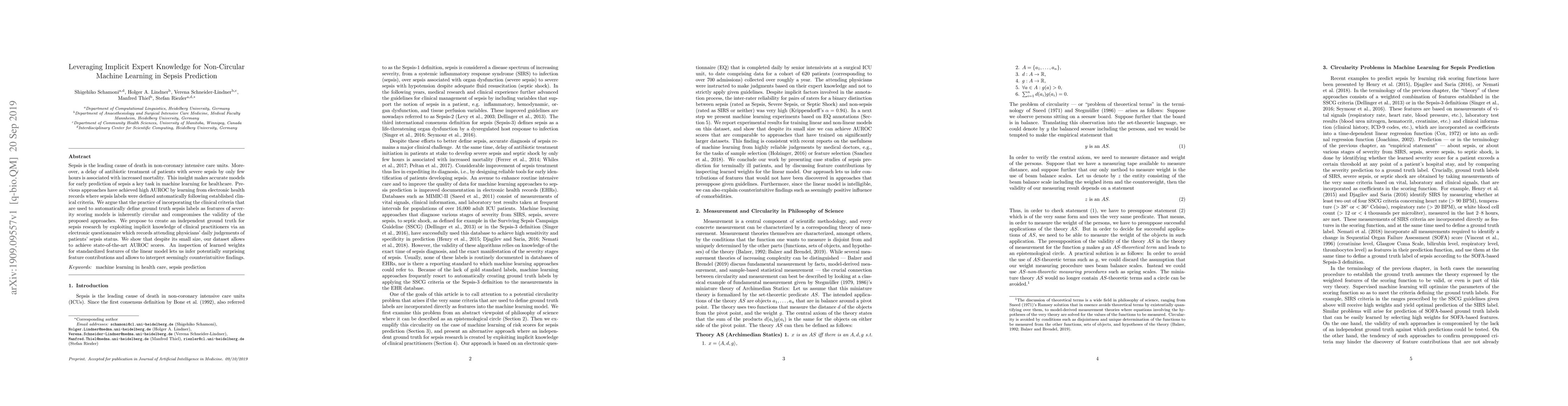 This paper proposes a novel method for sepsis prediction in healthcare by leveraging implicit expert knowledge from clinicians, avoiding circularity in using clinical criteria for both training and validation. The study demonstrates state-of-the-art performance using a small dataset derived from physician judgments, highlighting interpretable and counterintuitive feature contributions.
