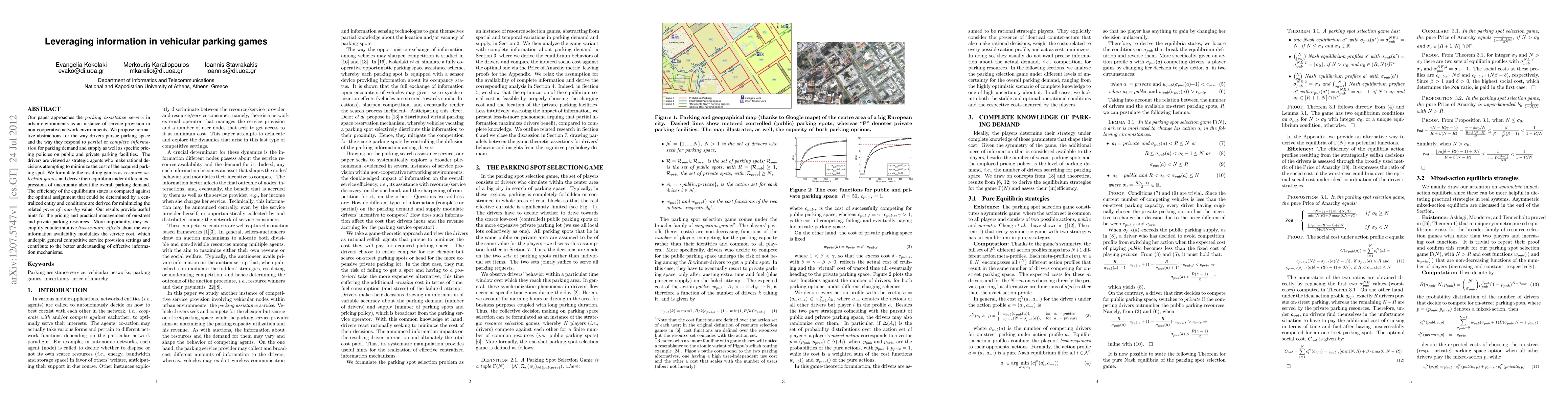 This paper models urban vehicular parking as a non-cooperative game where drivers, as strategic agents, aim to minimize parking costs. It analyzes equilibria under various information levels and compares their efficiency against a centralized optimal solution, revealing counterintuitive insights on how information affects service costs and informing effective pricing and management strategies for parking resources.