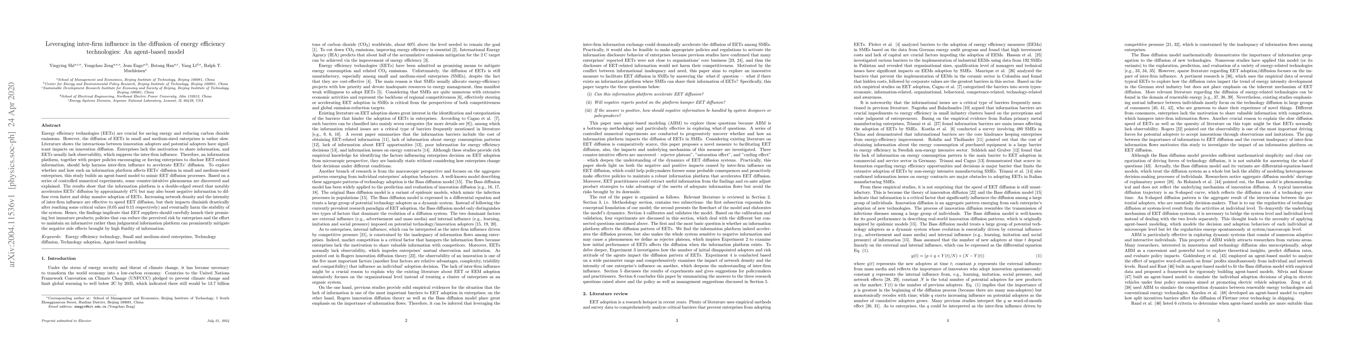This study uses an agent-based model to explore how an information platform can accelerate the diffusion of energy efficiency technologies (EETs) among small and medium-sized enterprises. The findings reveal that while the platform can boost EET diffusion by 47%, it also risks spreading negative information, which can delay widespread adoption and destabilize the system if inter-firm influence and network density are too high.