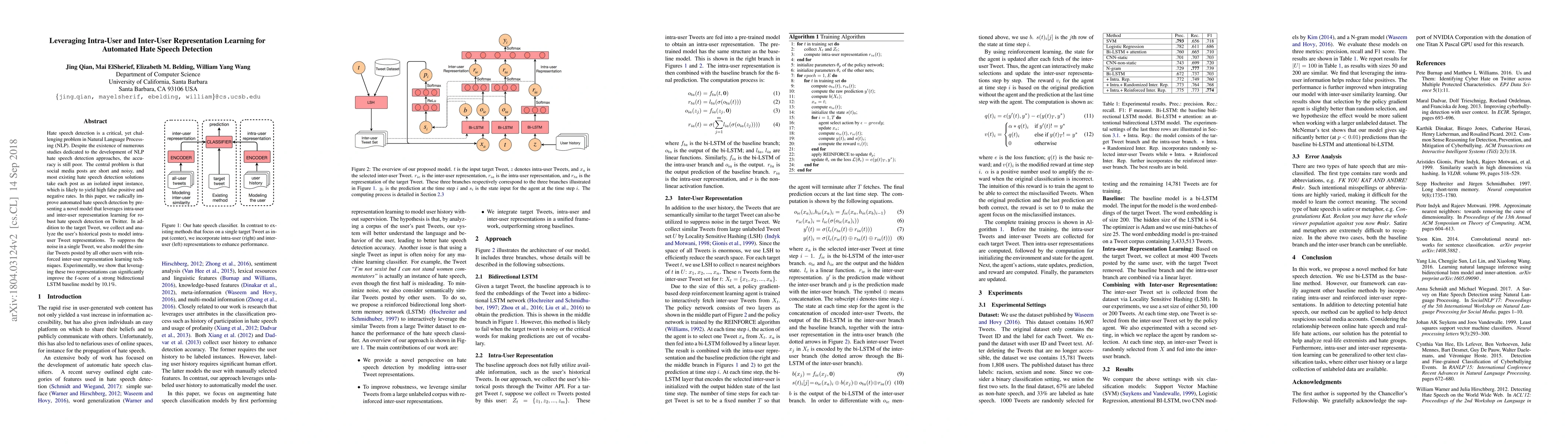 Hate speech detection is a critical, yet challenging problem in Natural Language Processing (NLP). Despite the existence of numerous studies dedicated to the development of NLP hate speech detection approaches, the accuracy is still poor. The central problem is that social media posts are short and noisy, and most existing hate speech detection solutions take each post as an isolated input instance, which is likely to yield high false positive and negative rates. In this paper, we radically improve automated hate speech detection by presenting a novel model that leverages intra-user and inter-user representation learning for robust hate speech detection on Twitter. In addition to the target Tweet, we collect and analyze the user's historical posts to model intra-user Tweet representations. To suppress the noise in a single Tweet, we also model the similar Tweets posted by all other users with reinforced inter-user representation learning techniques. Experimentally, we show that leveraging these two representations can significantly improve the f-score of a strong bidirectional LSTM baseline model by 10.1%.