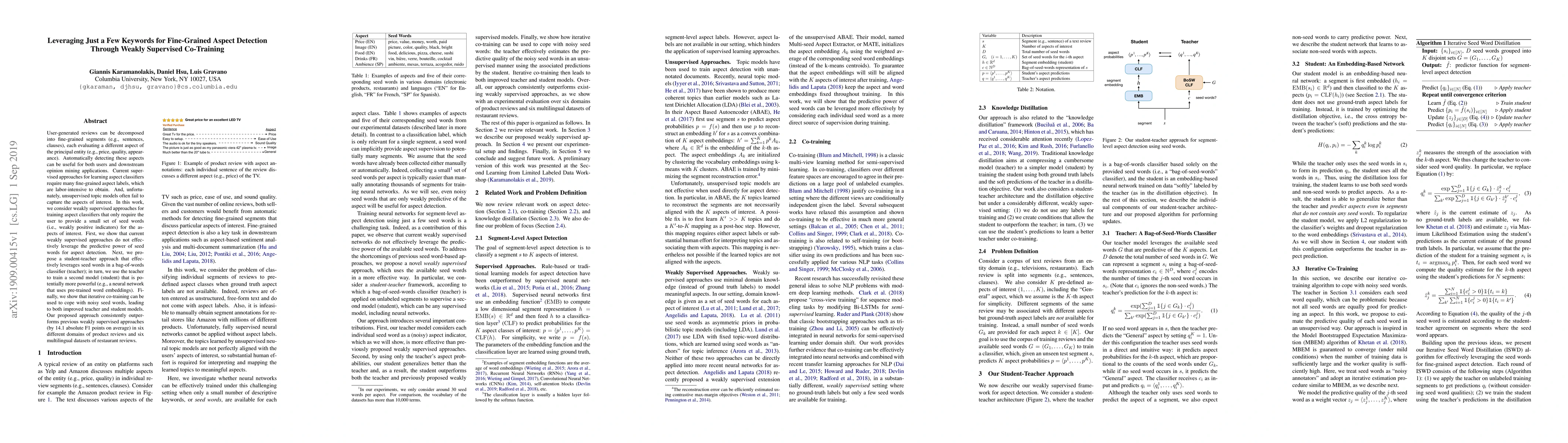 User-generated reviews can be decomposed into fine-grained segments (e.g., sentences, clauses), each evaluating a different aspect of the principal entity (e.g., price, quality, appearance). Automatically detecting these aspects can be useful for both users and downstream opinion mining applications. Current supervised approaches for learning aspect classifiers require many fine-grained aspect labels, which are labor-intensive to obtain. And, unfortunately, unsupervised topic models often fail to capture the aspects of interest. In this work, we consider weakly supervised approaches for training aspect classifiers that only require the user to provide a small set of seed words (i.e., weakly positive indicators) for the aspects of interest. First, we show that current weakly supervised approaches do not effectively leverage the predictive power of seed words for aspect detection. Next, we propose a student-teacher approach that effectively leverages seed words in a bag-of-words classifier (teacher); in turn, we use the teacher to train a second model (student) that is potentially more powerful (e.g., a neural network that uses pre-trained word embeddings). Finally, we show that iterative co-training can be used to cope with noisy seed words, leading to both improved teacher and student models. Our proposed approach consistently outperforms previous weakly supervised approaches (by 14.1 absolute F1 points on average) in six different domains of product reviews and six multilingual datasets of restaurant reviews.