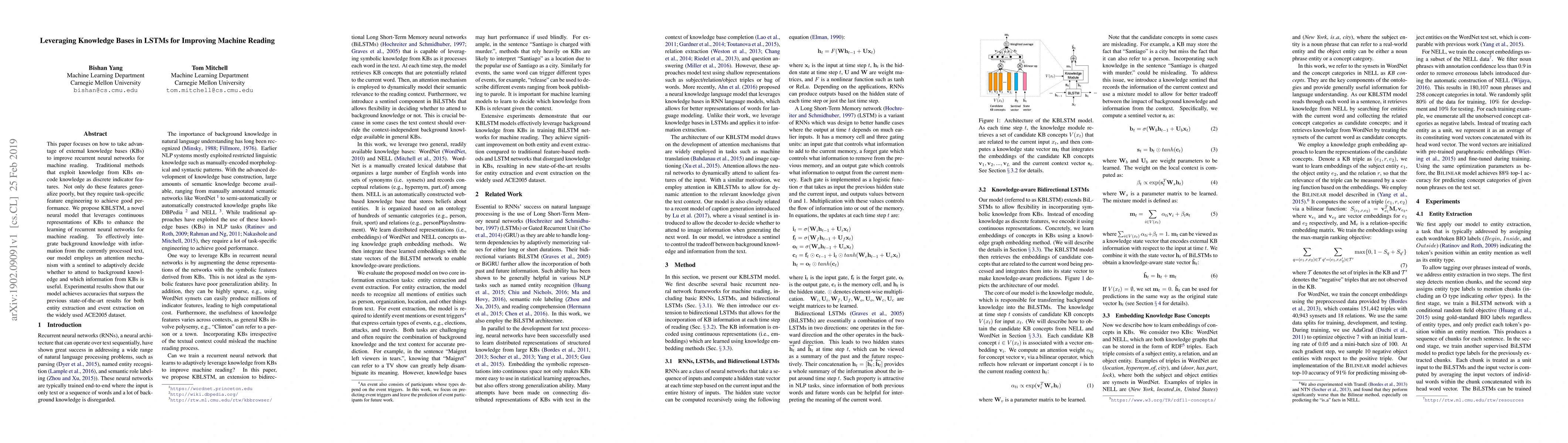 This paper proposes KBLSTM, a neural model that leverages continuous representations of knowledge bases to improve machine reading accuracy, outperforming previous state-of-the-art results for entity extraction and event extraction on the ACE2005 dataset.