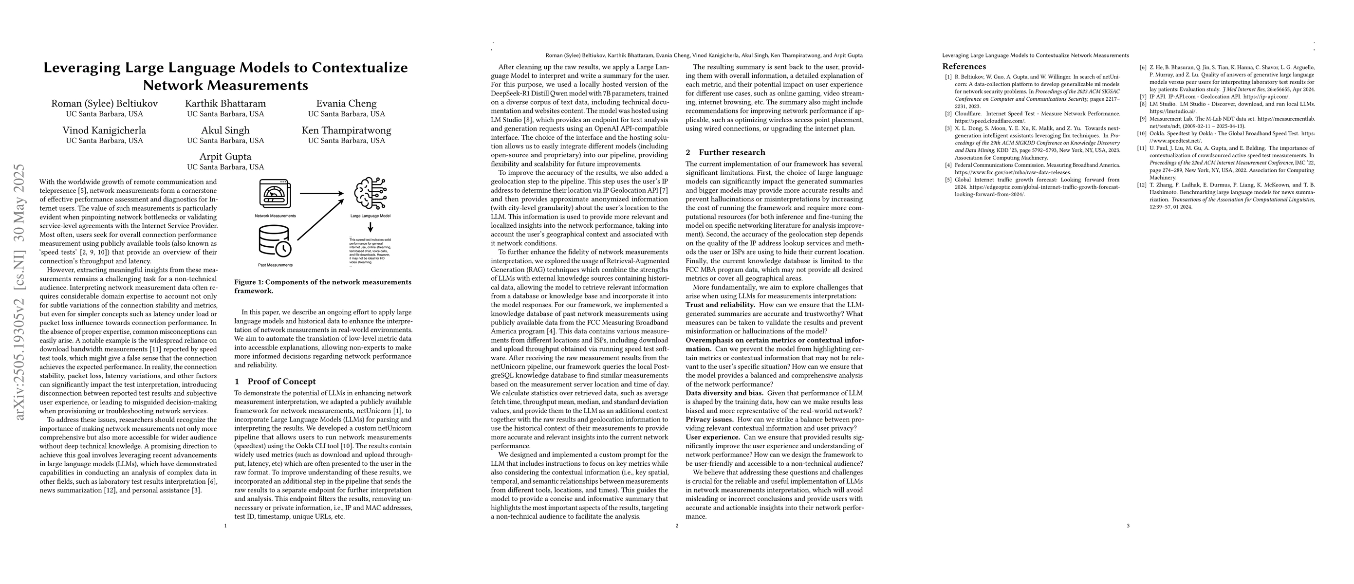 The paper describes an ongoing effort to apply large language models (LLMs) and historical network data to enhance the interpretation of network measurements for non-experts.