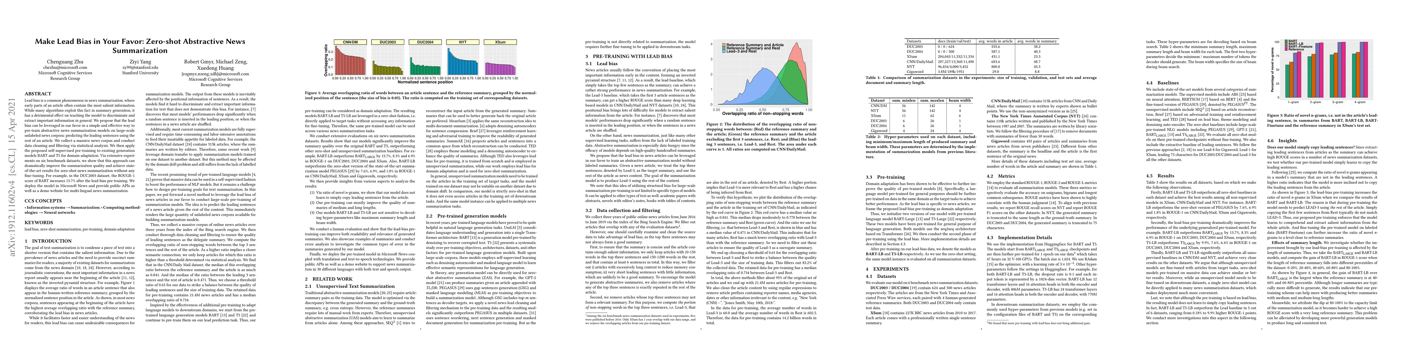 This paper proposes leveraging lead bias in news articles to pre-train abstractive summarization models on large unlabeled news corpora, achieving state-of-the-art results for zero-shot summarization without fine-tuning. The approach dramatically improves summarization quality, as demonstrated by a 13.7% increase in ROUGE-1 score for BART on the DUC2003 dataset.