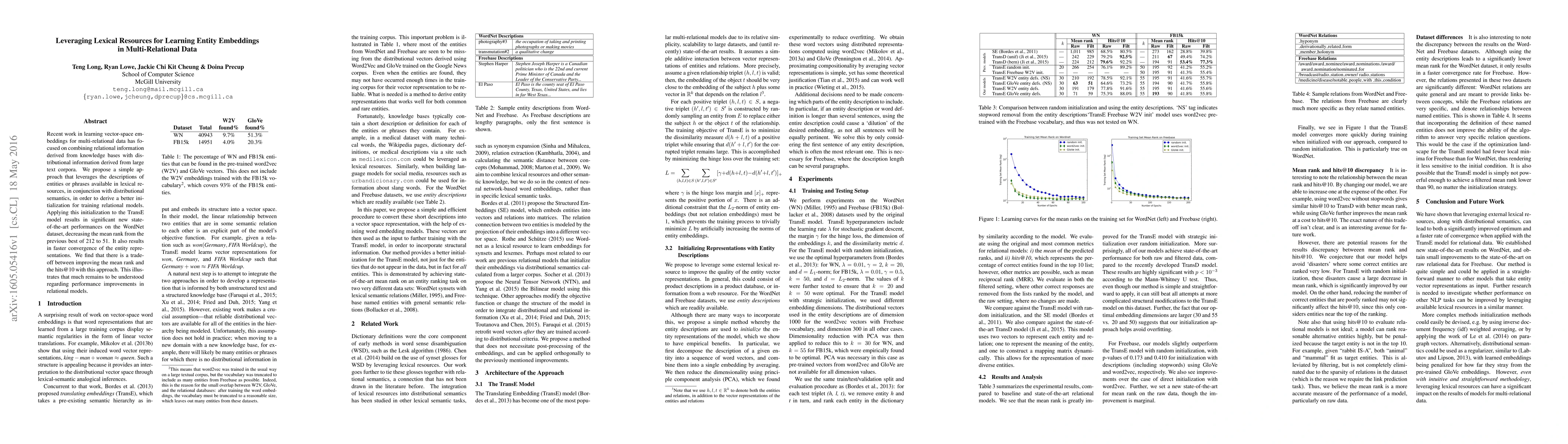 This paper proposes using lexical resources to initialize entity embeddings for multi-relational data, achieving state-of-the-art performance on the WordNet dataset and faster convergence. However, it notes a trade-off between mean rank improvement and hits@10, indicating further research is needed to optimize relational model performance.