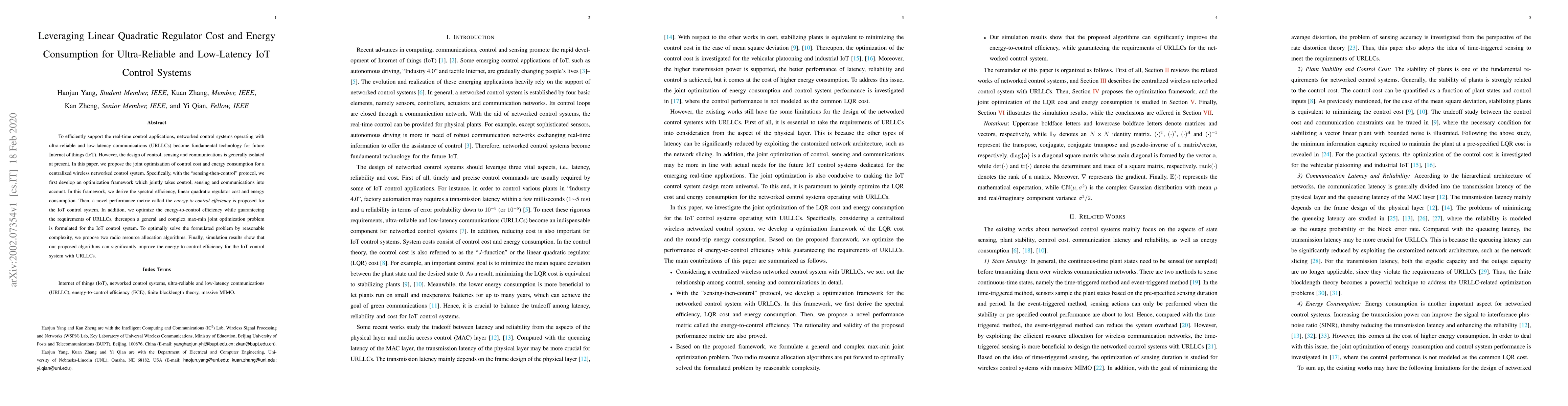 This paper proposes an optimization framework for ultra-reliable and low-latency IoT control systems, jointly optimizing control cost, energy consumption, and spectral efficiency. It introduces a new performance metric, energy-to-control efficiency, and presents algorithms to solve the complex joint optimization problem, demonstrating significant improvements in efficiency through simulations.