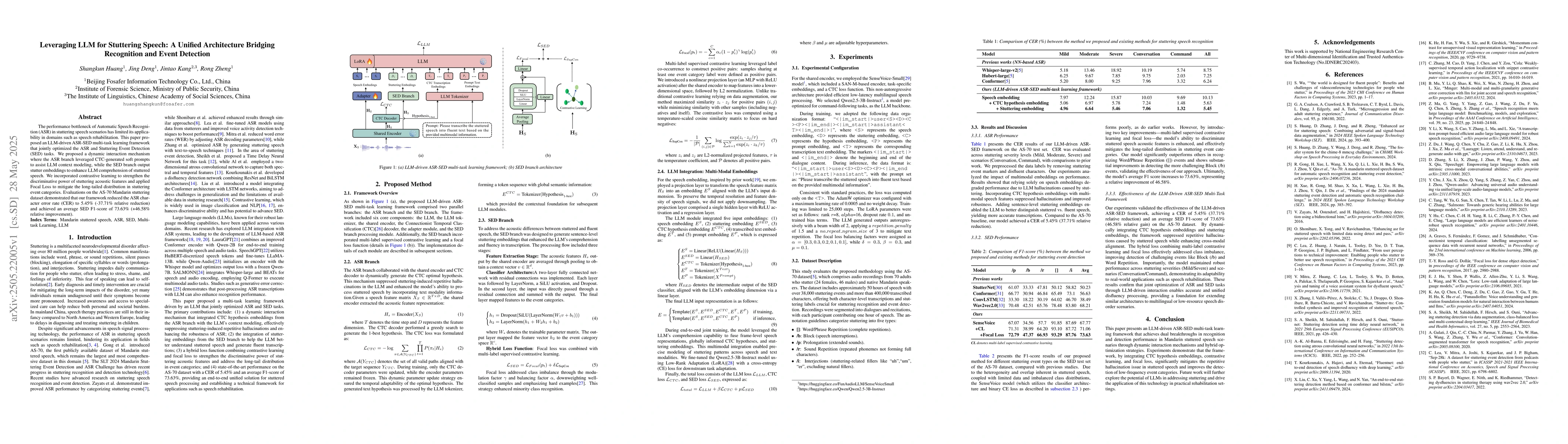 The research proposes an LLM-driven ASR-SED multi-task learning framework that jointly optimizes Automatic Speech Recognition (ASR) and Stuttering Event Detection (SED) tasks. It introduces a dynamic interaction mechanism where ASR uses CTC-generated soft prompts for LLM context modeling, and SED outputs stutter embeddings to enhance LLM comprehension of stuttered speech. Contrastive learning strengthens stuttering acoustic feature discrimination, while Focal Loss addresses the long-tailed distribution in stuttering event categories.