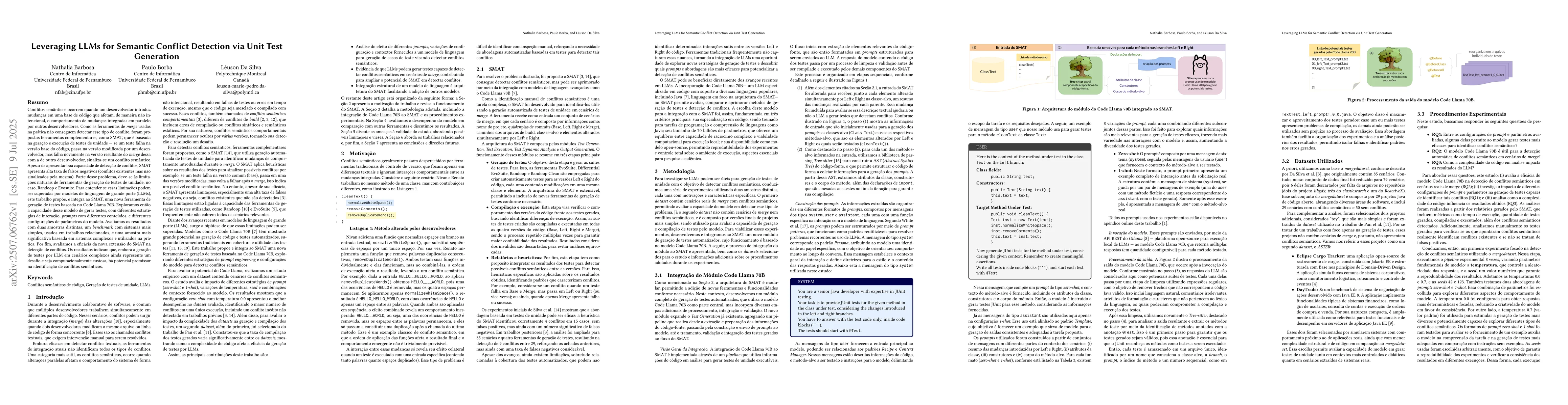 Semantic conflicts arise when a developer introduces changes to a codebase that unintentionally affect the behavior of changes integrated in parallel by other developers. Traditional merge tools are unable to detect such conflicts, so complementary tools like SMAT have been proposed. SMAT relies on generating and executing unit tests: if a test fails on the base version, passes on a developer's modified version, but fails again after merging with another developer's changes, a semantic conflict is indicated. While SMAT is effective at detecting conflicts, it suffers from a high rate of false negatives, partly due to the limitations of unit test generation tools such as Randoop and Evosuite. To investigate whether large language models (LLMs) can overcome these limitations, we propose and integrate a new test generation tool based on Code Llama 70B into SMAT. We explore the model's ability to generate tests using different interaction strategies, prompt contents, and parameter configurations. Our evaluation uses two samples: a benchmark with simpler systems from related work, and a more significant sample based on complex, real-world systems. We assess the effectiveness of the new SMAT extension in detecting conflicts. Results indicate that, although LLM-based test generation remains challenging and computationally expensive in complex scenarios, there is promising potential for improving semantic conflict detection. -- Conflitos sem^anticos surgem quando um desenvolvedor introduz mudan\c{c}as em uma base de c\'odigo que afetam, de forma n~ao intencional, o comportamento de altera\c{c}~oes integradas em paralelo por outros desenvolvedores. Ferramentas tradicionais de merge n~ao conseguem detectar esse tipo de conflito, por isso ferramentas complementares como o SMAT foram propostas. O SMAT depende da gera\c{c}~ao e execu\c{c}~ao de testes de unidade: se um teste falha na vers~ao base, passa na vers~ao modificada por um desenvolvedor, mas volta a falhar ap\'os o merge com as mudan\c{c}as de outro desenvolvedor, um conflito sem^antico \'e identificado. Embora o SMAT seja eficaz na detec\c{c}~ao de conflitos, apresenta alta taxa de falsos negativos, em parte devido \`as limita\c{c}~oes das ferramentas de gera\c{c}~ao de testes como Randoop e Evosuite. Para investigar se modelos de linguagem de grande porte (LLMs) podem superar essas limita\c{c}~oes, propomos e integramos ao SMAT uma nova ferramenta de gera\c{c}~ao de testes baseada no Code Llama 70B. Exploramos a capacidade do modelo de gerar testes utilizando diferentes estrat\'egias de intera\c{c}~ao, conte\'udos de prompts e configura\c{c}~oes de par^ametros. Nossa avalia\c{c}~ao utiliza duas amostras: um benchmark com sistemas mais simples, usados em trabalhos relacionados, e uma amostra mais significativa baseada em sistemas complexos e reais. Avaliamos a efic\'acia da nova extens~ao do SMAT na detec\c{c}~ao de conflitos. Os resultados indicam que, embora a gera\c{c}~ao de testes por LLM em cen\'arios complexos ainda seja desafiadora e custosa computacionalmente, h\'a potencial promissor para aprimorar a detec\c{c}~ao de conflitos sem^anticos.