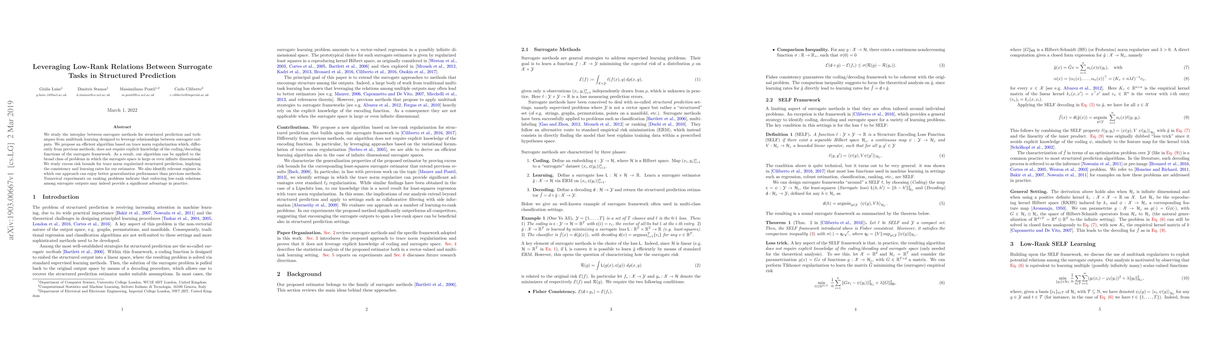 This paper proposes an efficient algorithm for structured prediction leveraging low-rank relations between surrogate tasks, using trace norm regularization without requiring explicit knowledge of surrogate functions. The method shows better generalization performance and consistency in various settings, as demonstrated by numerical experiments on ranking problems.