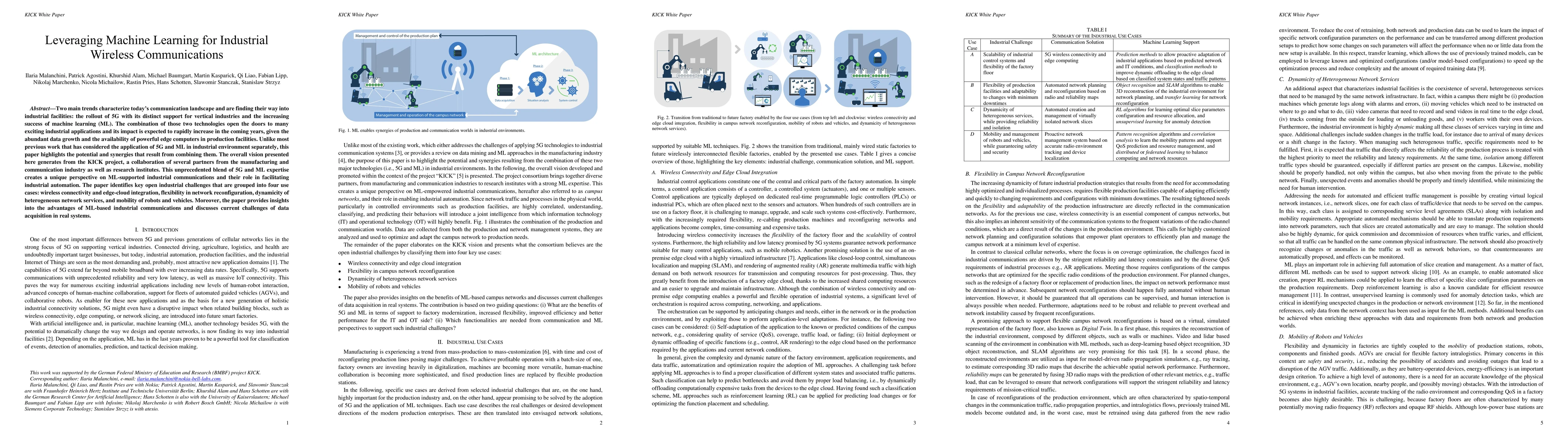 Two main trends characterize today's communication landscape and are finding their way into industrial facilities: the rollout of 5G with its distinct support for vertical industries and the increasing success of machine learning (ML). The combination of those two technologies open the doors to many exciting industrial applications and its impact is expected to rapidly increase in the coming years, given the abundant data growth and the availability of powerful edge computers in production facilities. Unlike most previous work that has considered the application of 5G and ML in industrial environment separately, this paper highlights the potential and synergies that result from combining them. The overall vision presented here generates from the KICK project, a collaboration of several partners from the manufacturing and communication industry as well as research institutes. This unprecedented blend of 5G and ML expertise creates a unique perspective on ML-supported industrial communications and their role in facilitating industrial automation. The paper identifies key open industrial challenges that are grouped into four use cases: wireless connectivity and edge-cloud integration, flexibility in network reconfiguration, dynamicity of heterogeneous network services, and mobility of robots and vehicles. Moreover, the paper provides insights into the advantages of ML-based industrial communications and discusses current challenges of data acquisition in real systems.