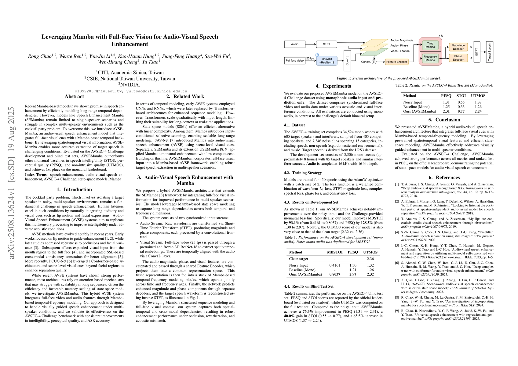 AVSEMamba integrates full-face video and audio features through Mamba-based temporal-frequency modeling, capturing both spatial-temporal and cross-modal dependencies for robust enhancement performance under occlusion, reverberation, and acoustic mismatch.