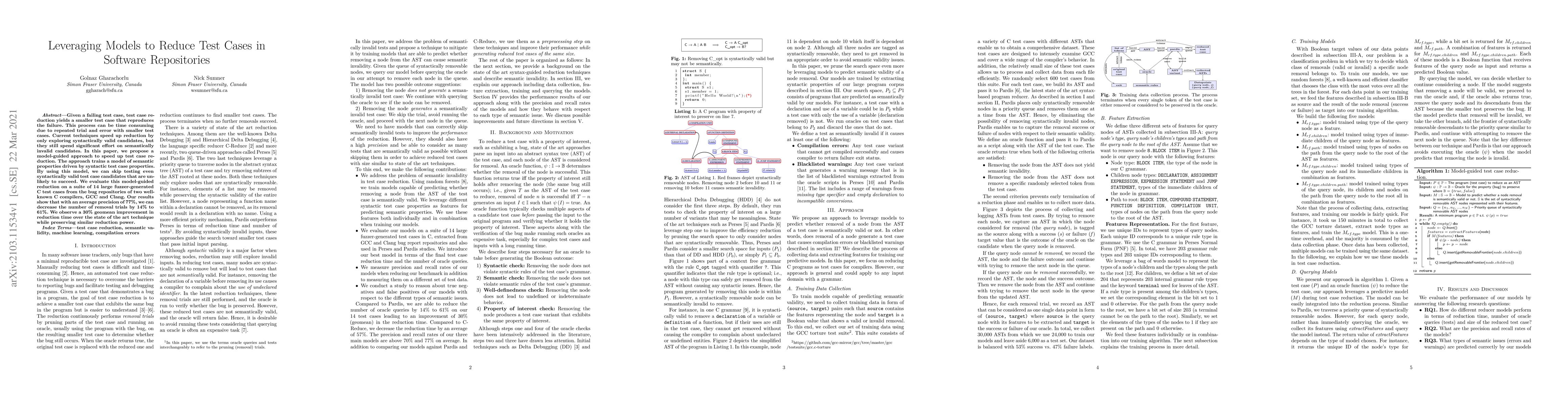 This paper proposes a model-guided approach to accelerate test case reduction by training a model on semantic properties derived from syntactic test case properties, allowing the skipping of semantically invalid candidates. Evaluations on C test cases from GCC and Clang show a 30% geomean reduction in time with a 14% to 61% decrease in removal trials.