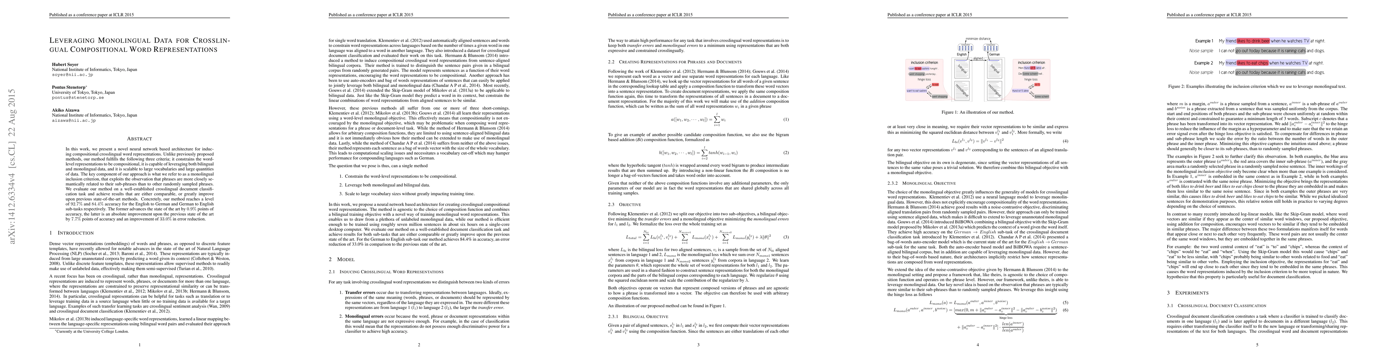 This paper introduces a neural network architecture for generating compositional crosslingual word representations using both bilingual and monolingual data. The method achieves state-of-the-art results in crosslingual document classification, improving accuracy by 0.9% for English to German and by 7.7% for German to English.